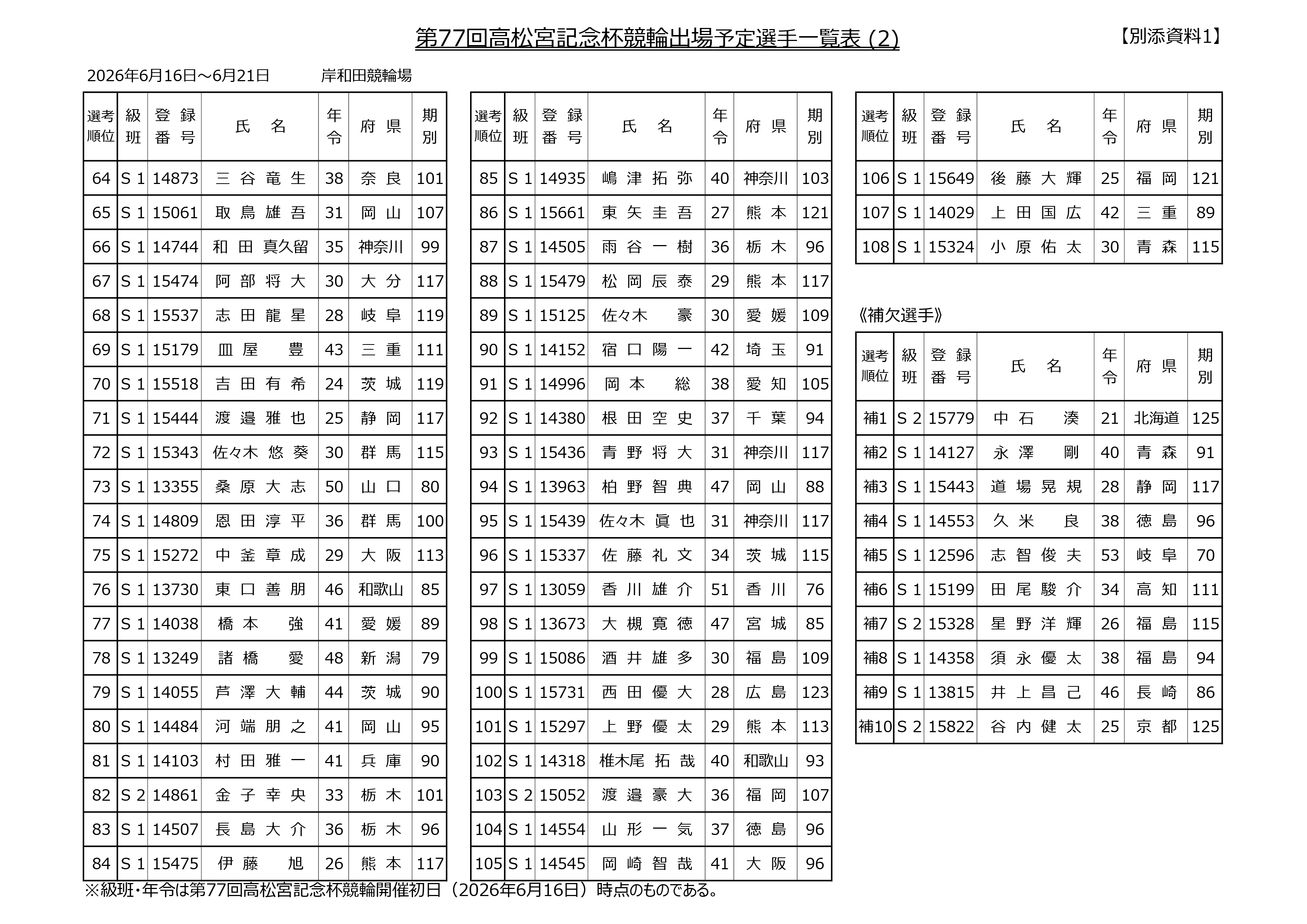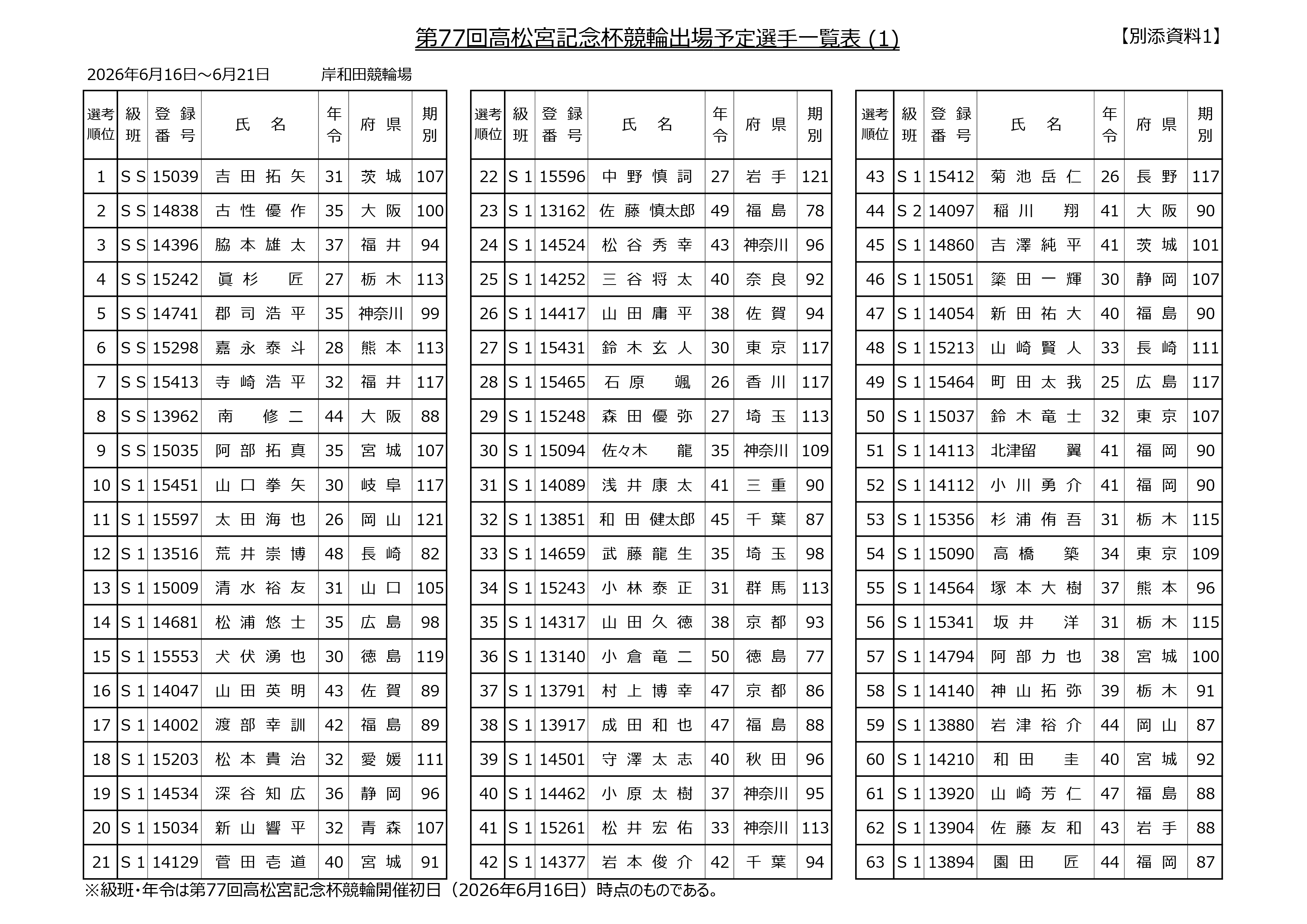 2026年6月16日(火)から21日(日)までの6日間、岸和田競輪場において開催される『第77回高松宮記念杯競輪』の出場予定選手が決定しましたので、お知らせいたします。