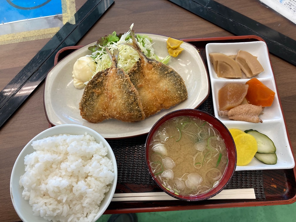 「アジフライは揚げたて。やや小ぶりながらも、サクサクした歯ごたえと、アジのジューシーさも感じられる一品。添え物の小鉢が嬉しいですね。ご飯やみそ汁もちょうどいい塩梅です」