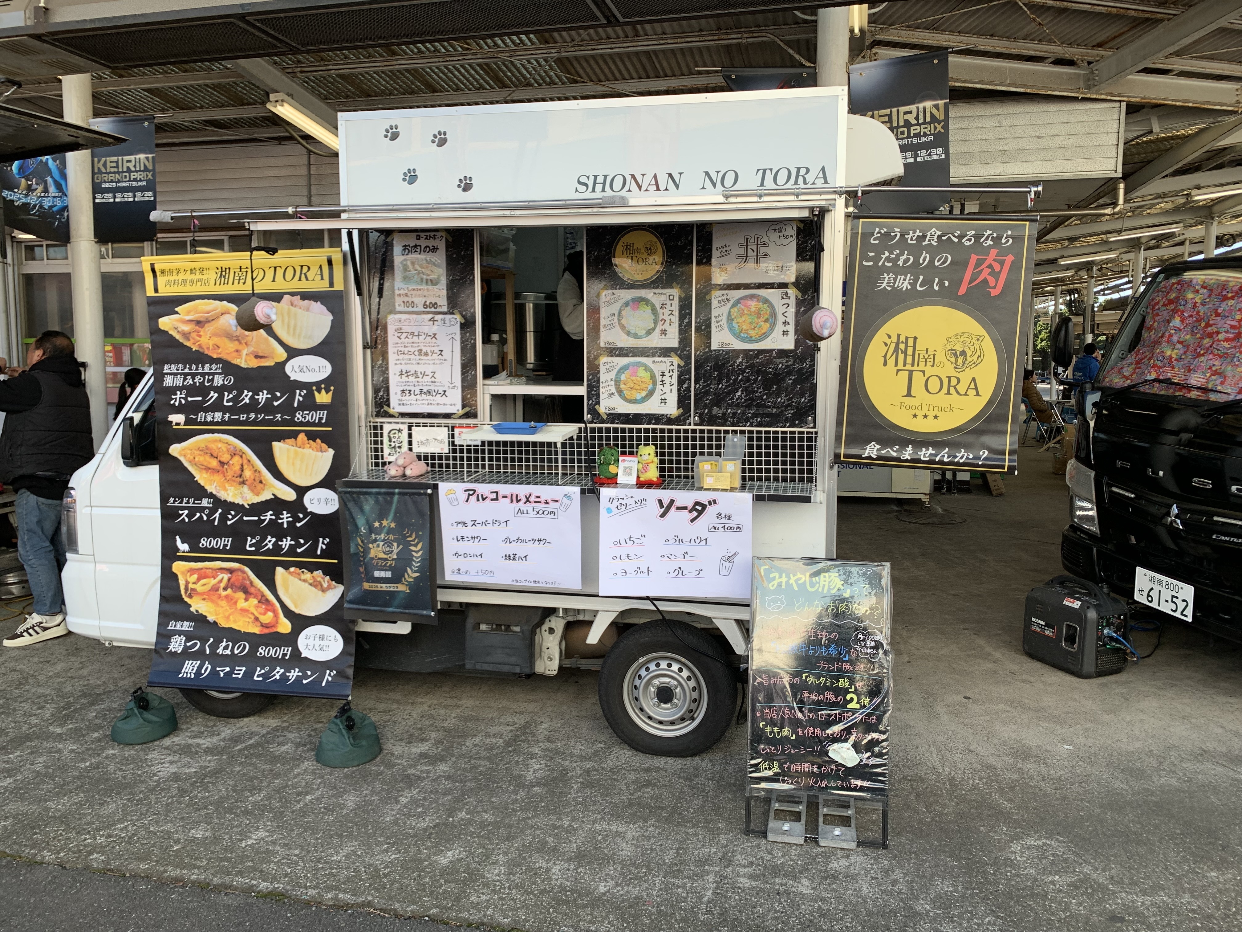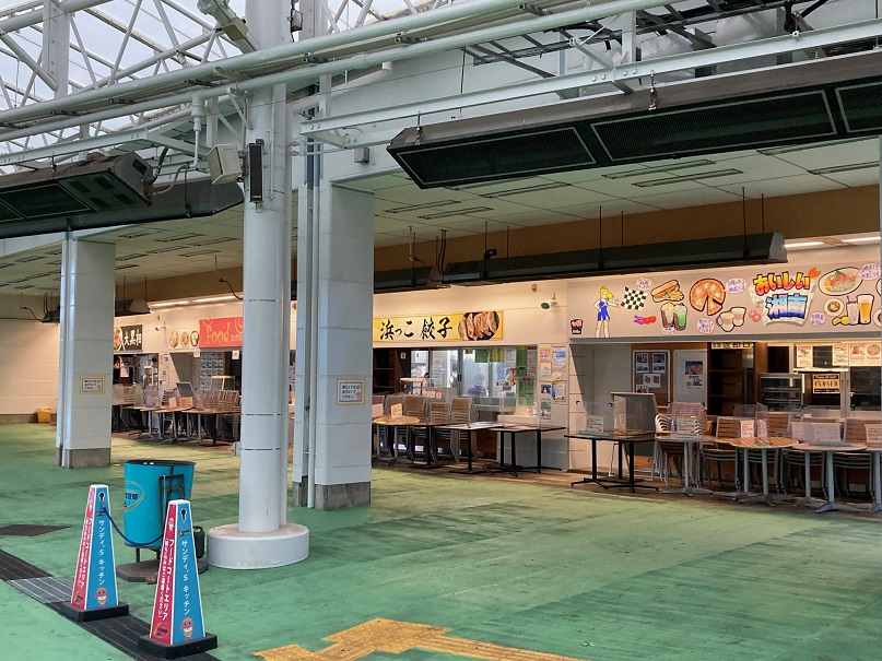 平塚競輪場は正門から入場後、オーロラビジョンに面した第四コーナースタンド裏側に四店舗、そこから少し