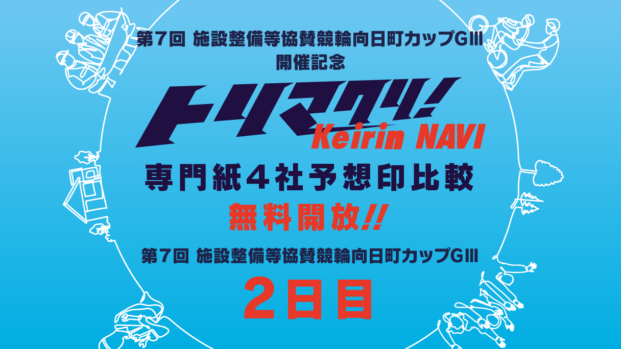 施設整備等協賛競輪京都向日町カップGⅢ 6月8日~11日の開催期間中は毎日、12レース分の専門紙4社の予想印を『無料』 公開! 4社それぞれの記者の予想をまとめてチェック・比較できるのは「トリマクリ」だけ! そこにあなたの予想を加えて、勝率アップを目指そう!
