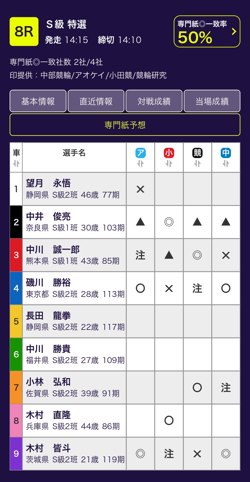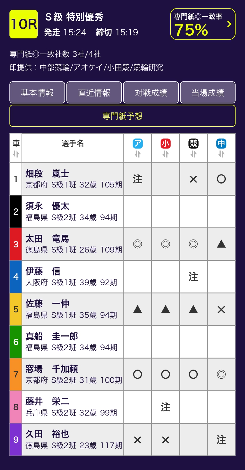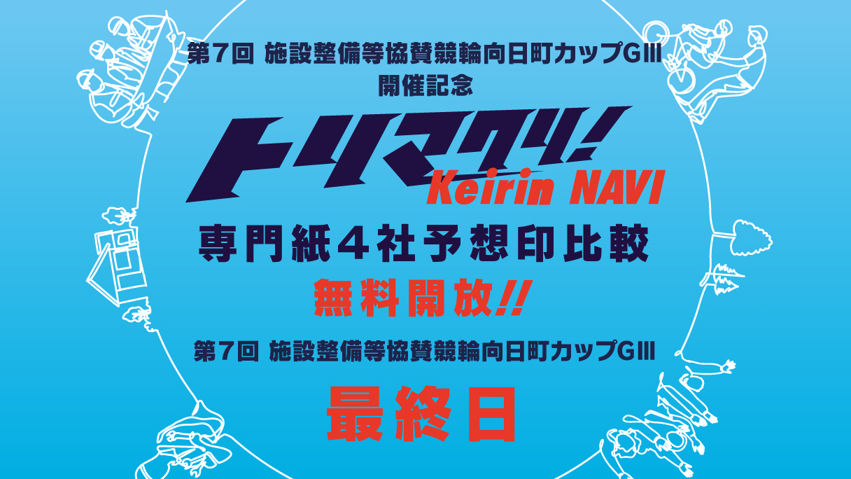 施設整備等協賛競輪京都向日町カップGⅢ 6月8日~11日の開催期間中は毎日、12レース分の専門紙4社の予想印を『無料』 公開! 4社それぞれの記者の予想をまとめてチェック・比較できるのは「トリマクリ」だけ! そこにあなたの予想を加えて、勝率アップを目指そう!