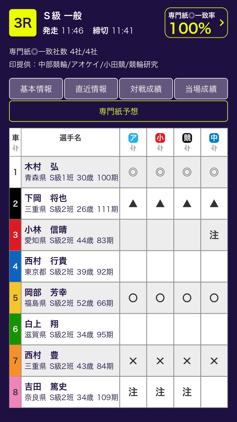 4社一致で①木村弘に支持が集まった。対抗も⑤岡部芳幸で一致。果たして硬く決まるのか?穴で狙うなら②下岡将也。レースは淡白の極みだが、力さえ出し切れれば強い。