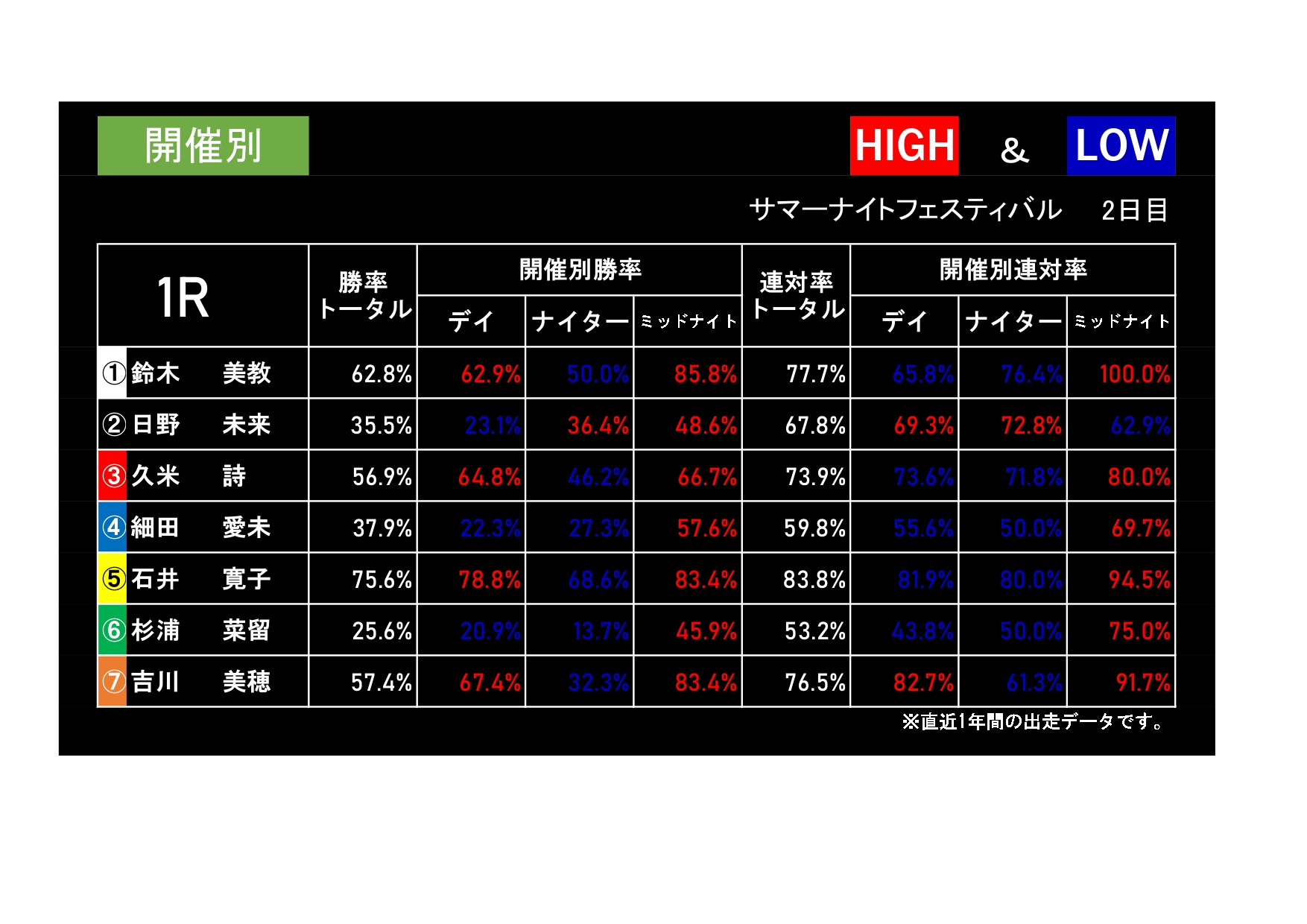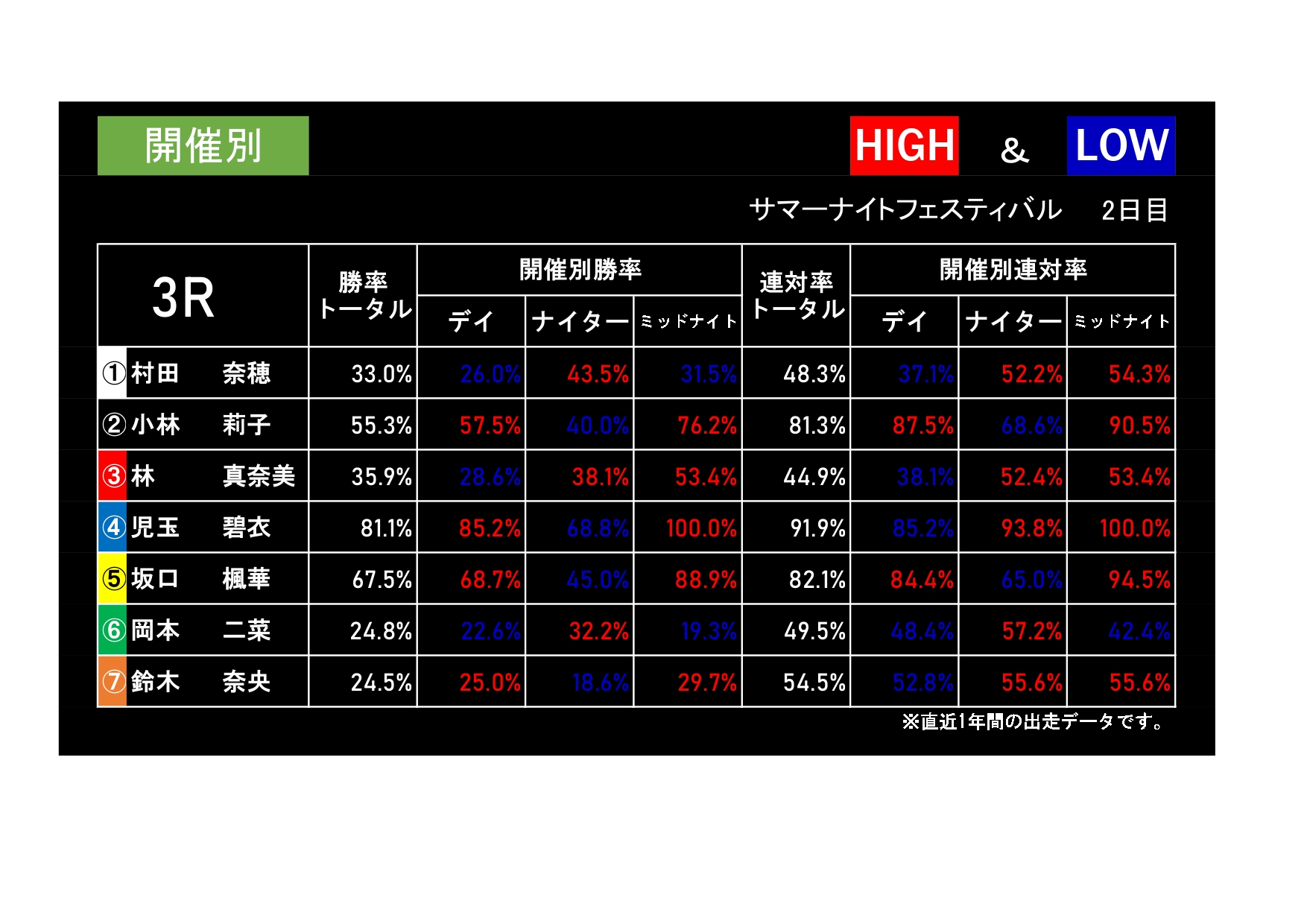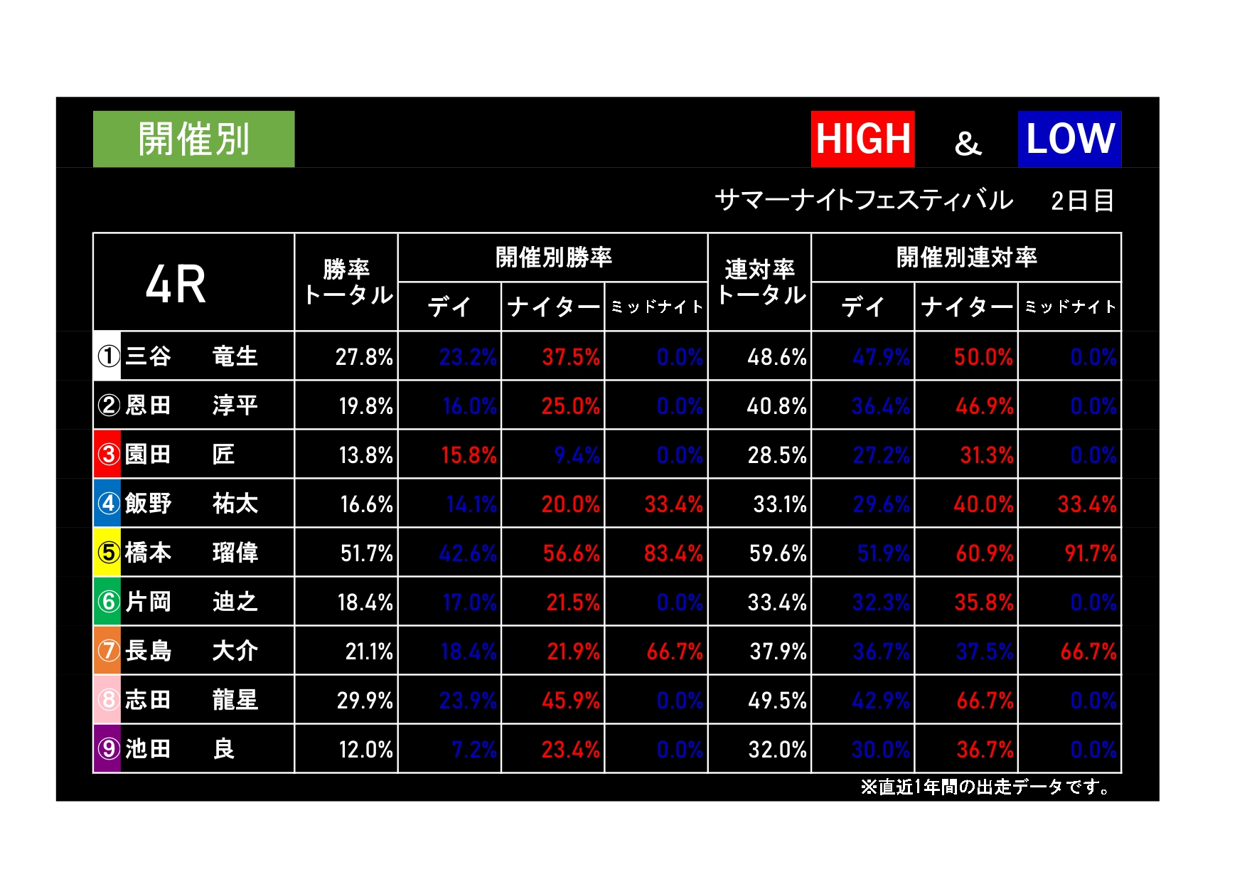 ナイター開催となる今節。選手の中には時間帯によって得意、不得意も少なからずあるはず。分母は違うものの、オリジナル勝率データを選手別に大公開!!少しでも車券の予想に役立てていただければ幸いです!!