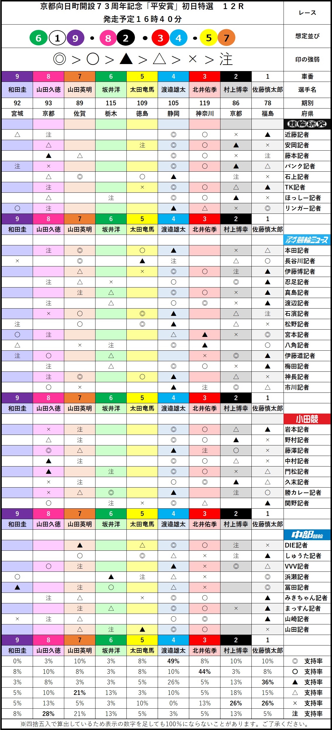 ▲支持は①佐藤慎太郎。やはりSS班の貫禄はあるし、今節唯一のSS班で存在感も際立つ。託す⑥坂井がイマイチなので、その分割引もあるが一定数の支持は集めた。