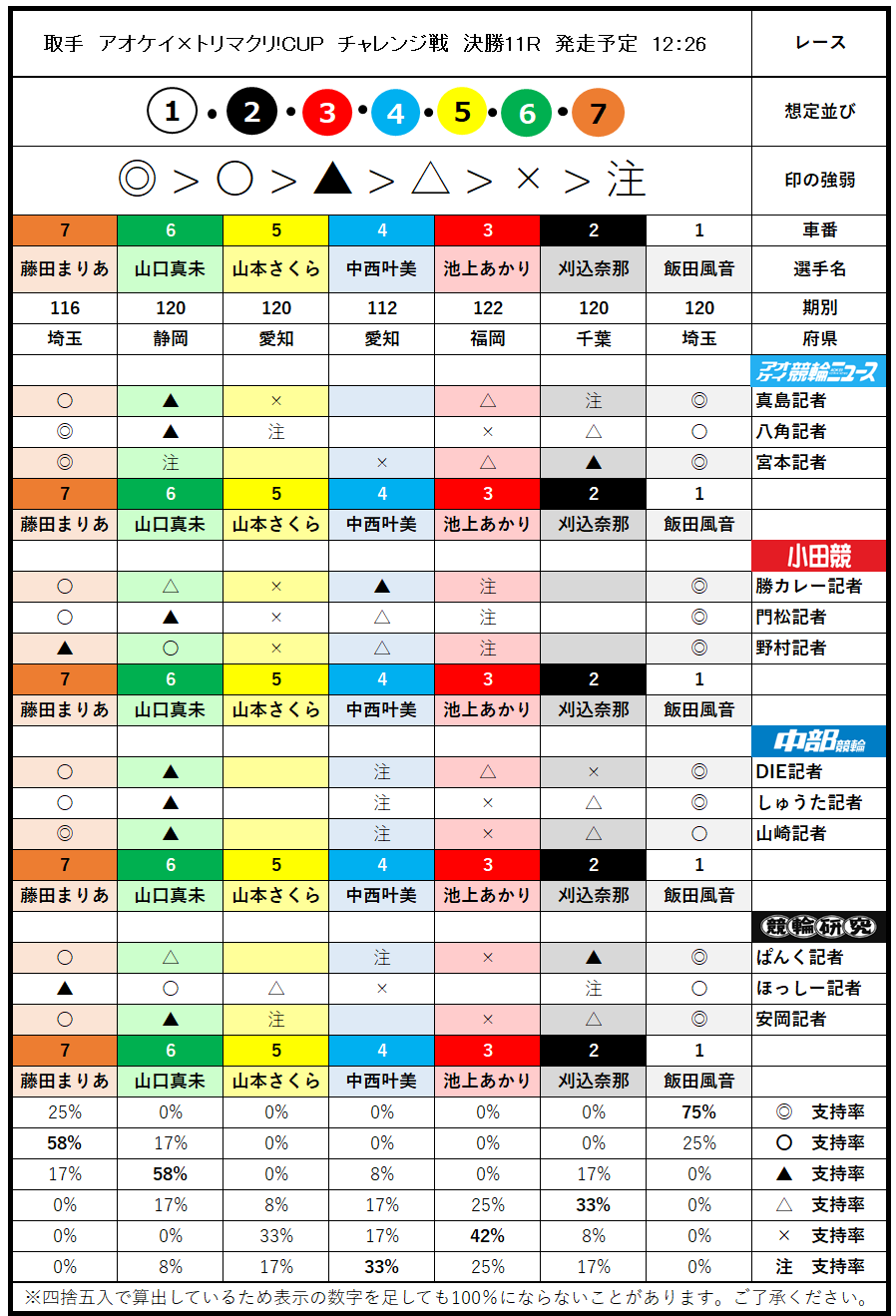 断トツの人気を誇る①飯田風音。決勝は一車番と位置取りも有利とみた。