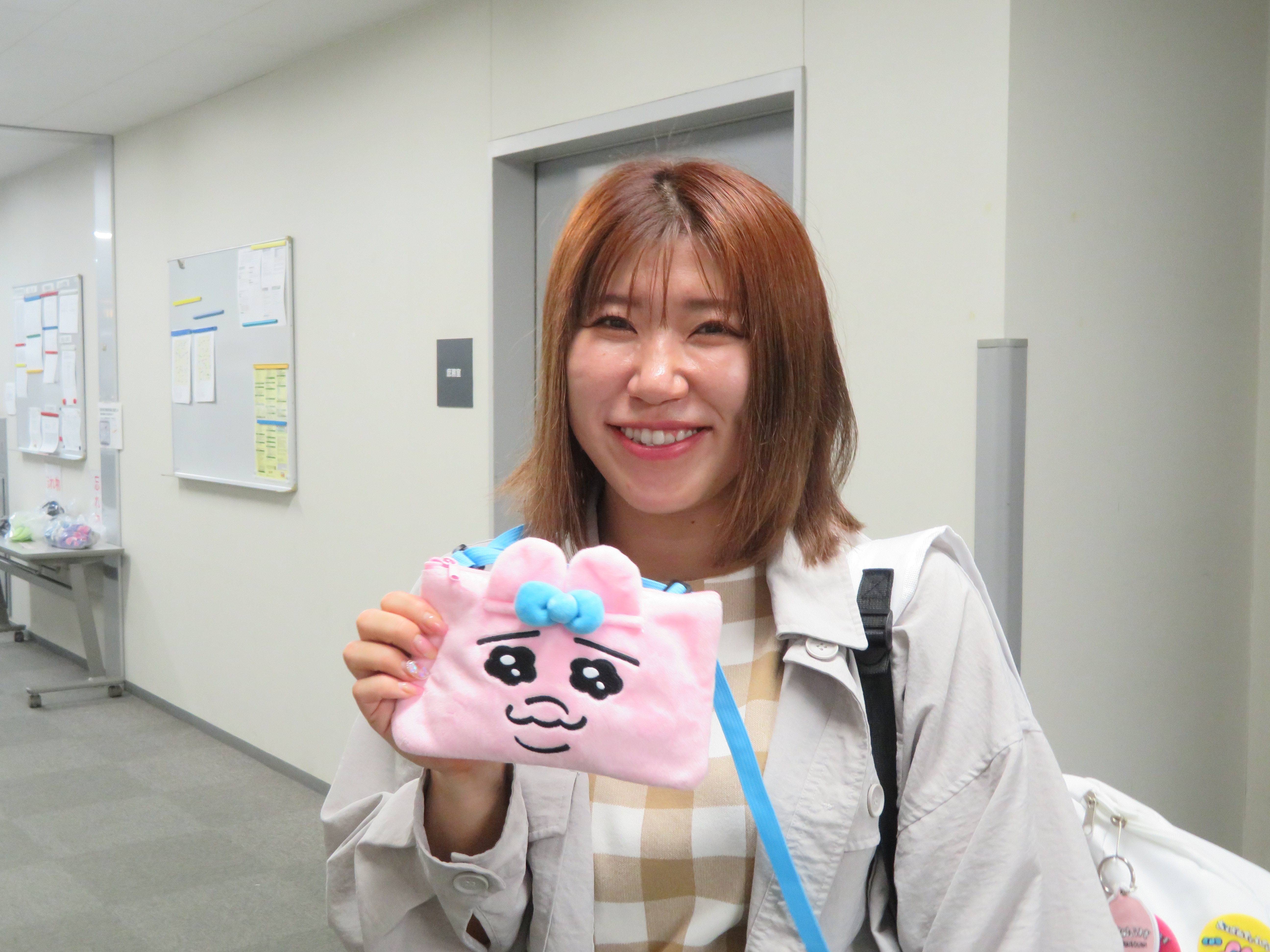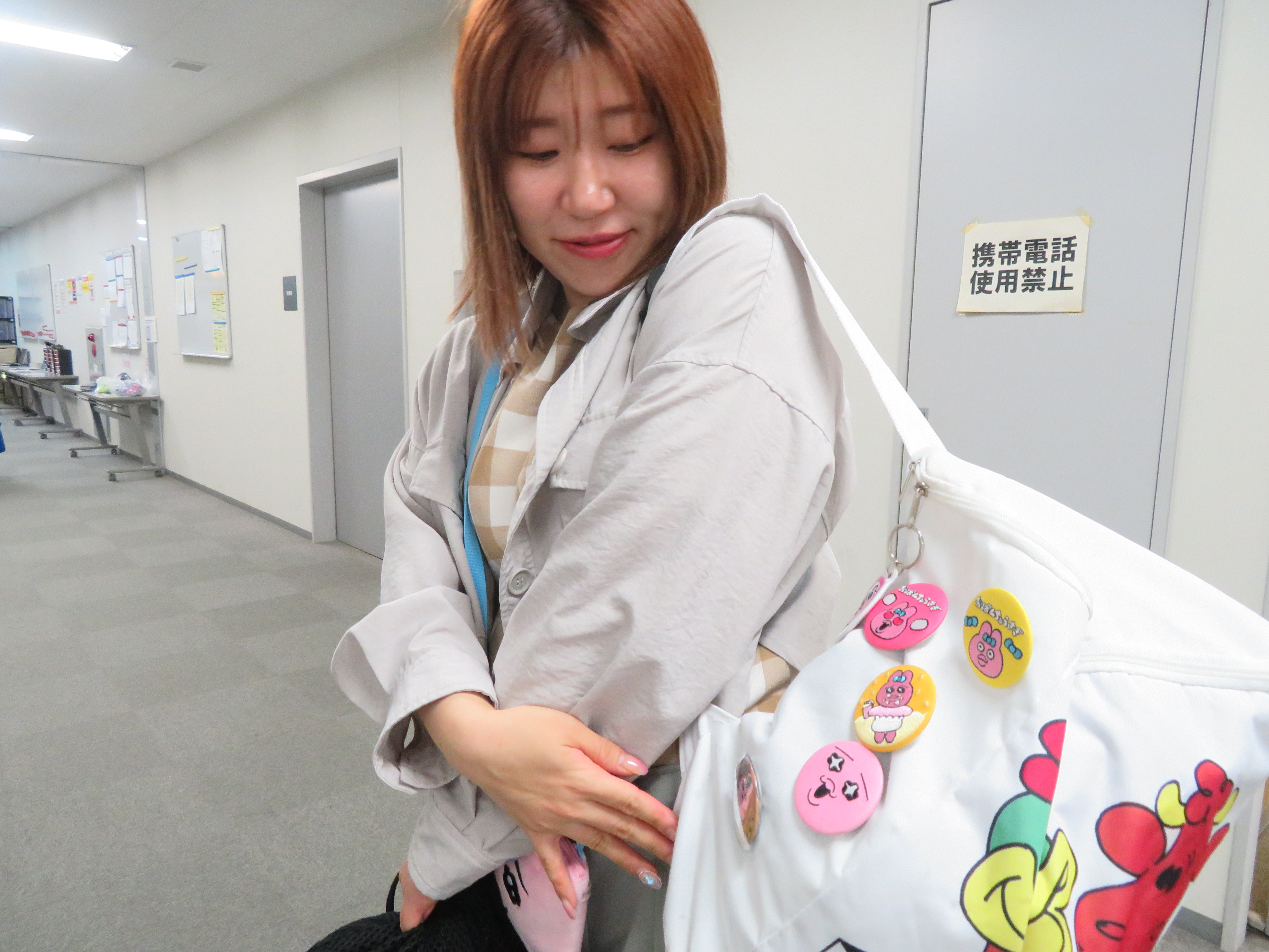 そんな山原だったが、写真を撮らせてもらう時には、“おぱんちゅうさぎ”のポーチと共に笑顔。「東のガールズの中では“ちいかわ”が流行っているので、日野未来が『西はおぱんちゅうさぎで行こう』って言うので」と教えてくれた。持っているバッグに目をやると、バッジもたくさん付いていた。可愛いキャラクターグッズに囲まれ、山原のメンタルは急上昇!?