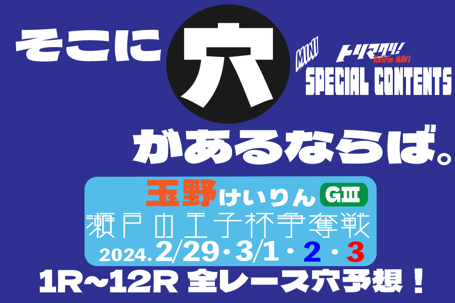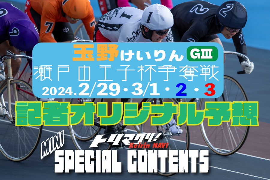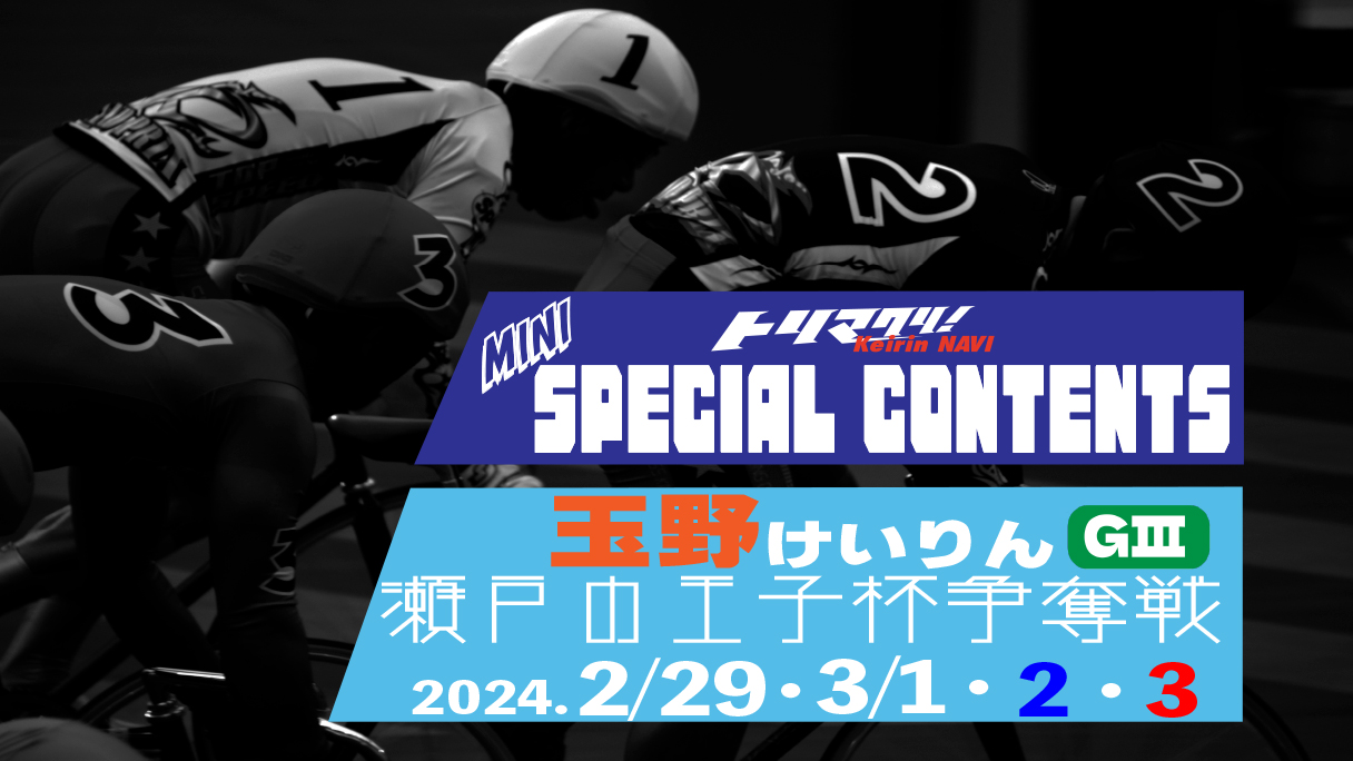 トリマクリ!Keirin NAVIではグレードレースではSPECIALCONTENTSを開設していましたが、この度全記念レースでSPECIALCONTENTSを開設します! その名もMINI SPECIALCONTENTS! 車券の参考になるトリマクリ!記者によるオリジナル予想!当たれば一攫千金高配当を狙う穴予想まで是非車券購入の参考に☆ 今回は「玉野競輪 瀬戸の王子杯争奪戦GⅢ」