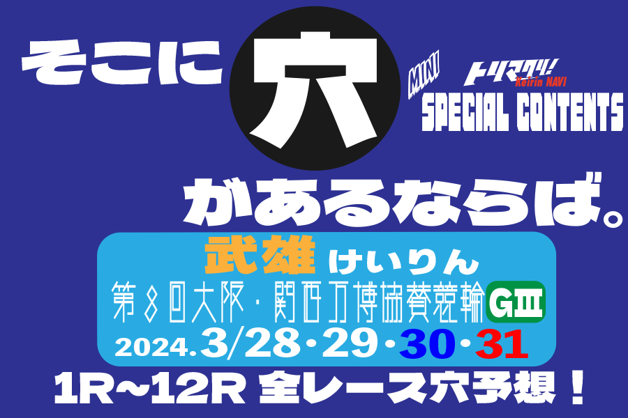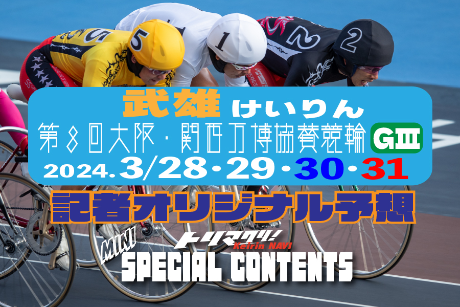 トリマクリ!Keirin NAVIではグレードレースではSPECIALCONTENTSを開設していましたが、この度全記念レースでSPECIALCONTENTSを開設します! その名もMINI SPECIALCONTENTS! 車券の参考になるトリマクリ!記者によるオリジナル予想!当たれば一攫千金高配当を狙う穴予想まで是非車券購入の参考に☆ 今回は「武雄競輪 第8回大阪・関西万博協賛競輪GⅢ」