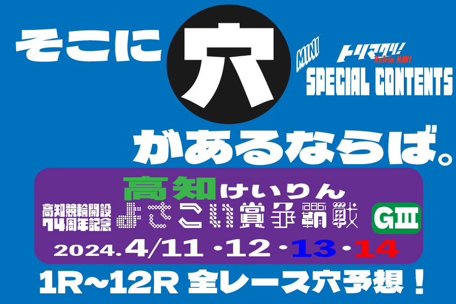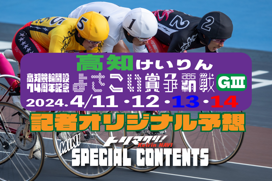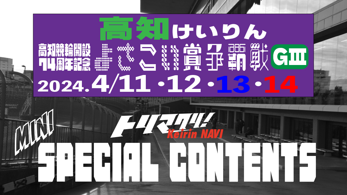 トリマクリ!Keirin NAVIではグレードレースではSPECIALCONTENTSを開設していましたが、この度全記念レースでSPECIALCONTENTSを開設します! その名もMINI SPECIALCONTENTS! 車券の参考になるトリマクリ!記者によるオリジナル予想!当たれば一攫千金高配当を狙う穴予想まで是非車券購入の参考に☆ 今回は「高知競輪 よさこい賞争覇戦GⅢ」