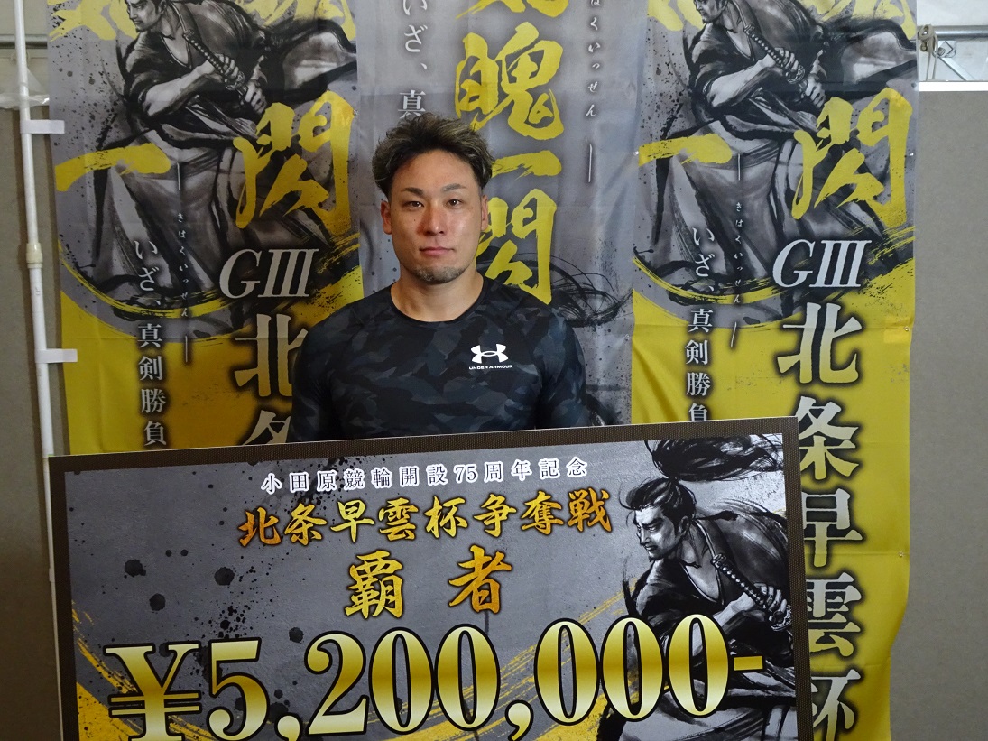 「前受けの想定で、突っ張るか下げるかは半々。踏みながら出させるレースも想定していました。詰まっているタイミングで行って行き切れました。二コーナーの下りで伸びたし、さらに三コーナーの上りでもスピードに乗せられた。ただ、後ろの(佐藤)慎太郎さんは時間差で上るタイミングになってしまったので、そこは申し訳なかった。雨は自分らしいというか、悪いコンディションの方が良いです。良い意味で気持ちが上がるので。小田原のバンクは練習にも行く時もあるし、見慣れた風景でしたよ(笑)。みんなは雨で視野が狭かったと思いますけどね。」