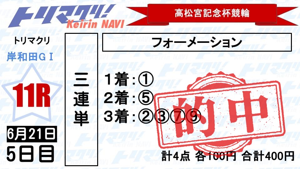 この強力すぎる本線をやっつけるなら四国の怪物として活躍している⑨犬伏湧也。パワーはおそらくこの中で一番、ラインも3車と一番長く、好機にドカ~ンと行けば⑤寺崎も簡単には捲れないし、番手を回る③岩津裕介にもチャンスは出てきそう。