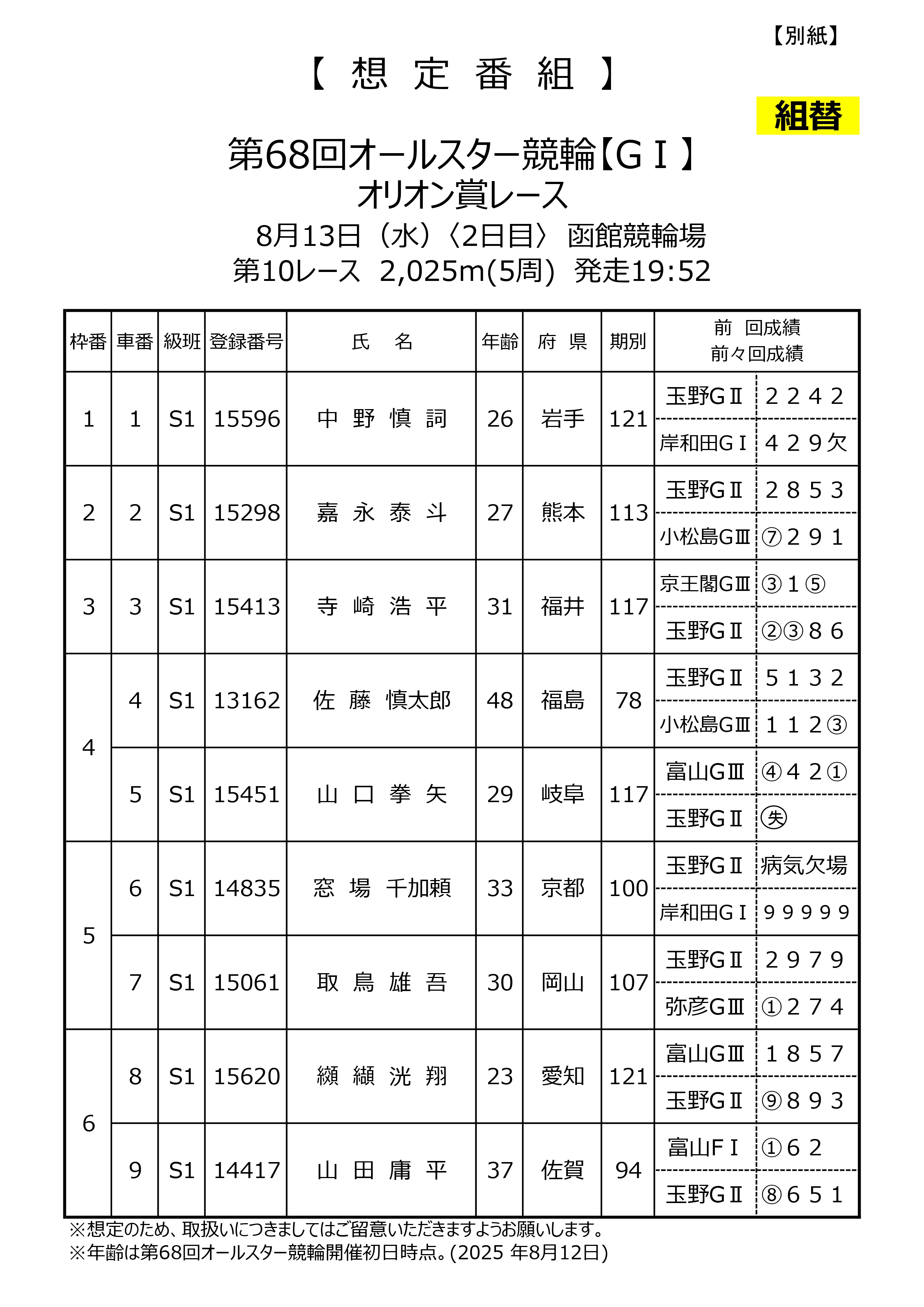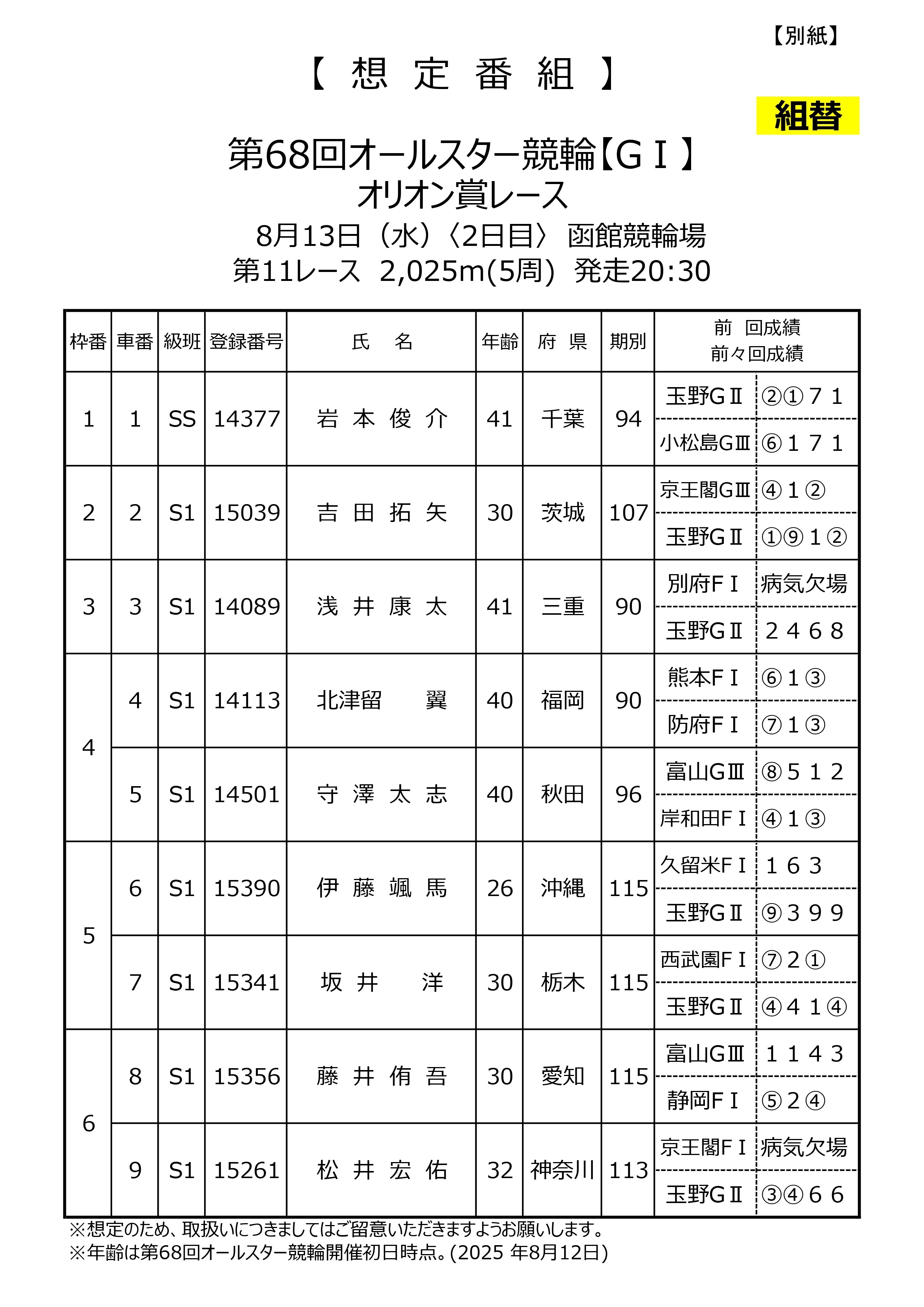 8月4日に発表いたしました第68回オールスター競輪「ドリームレース」「オリオン賞レース」想定番組について、出場予定選手に欠場が発生しましたので、別紙のとおり想定番組を再度お知らせいたします。