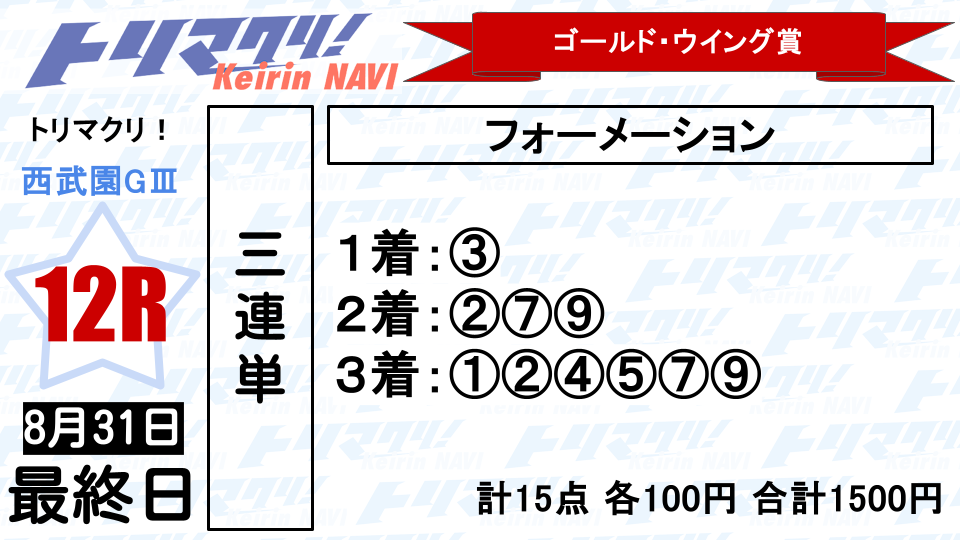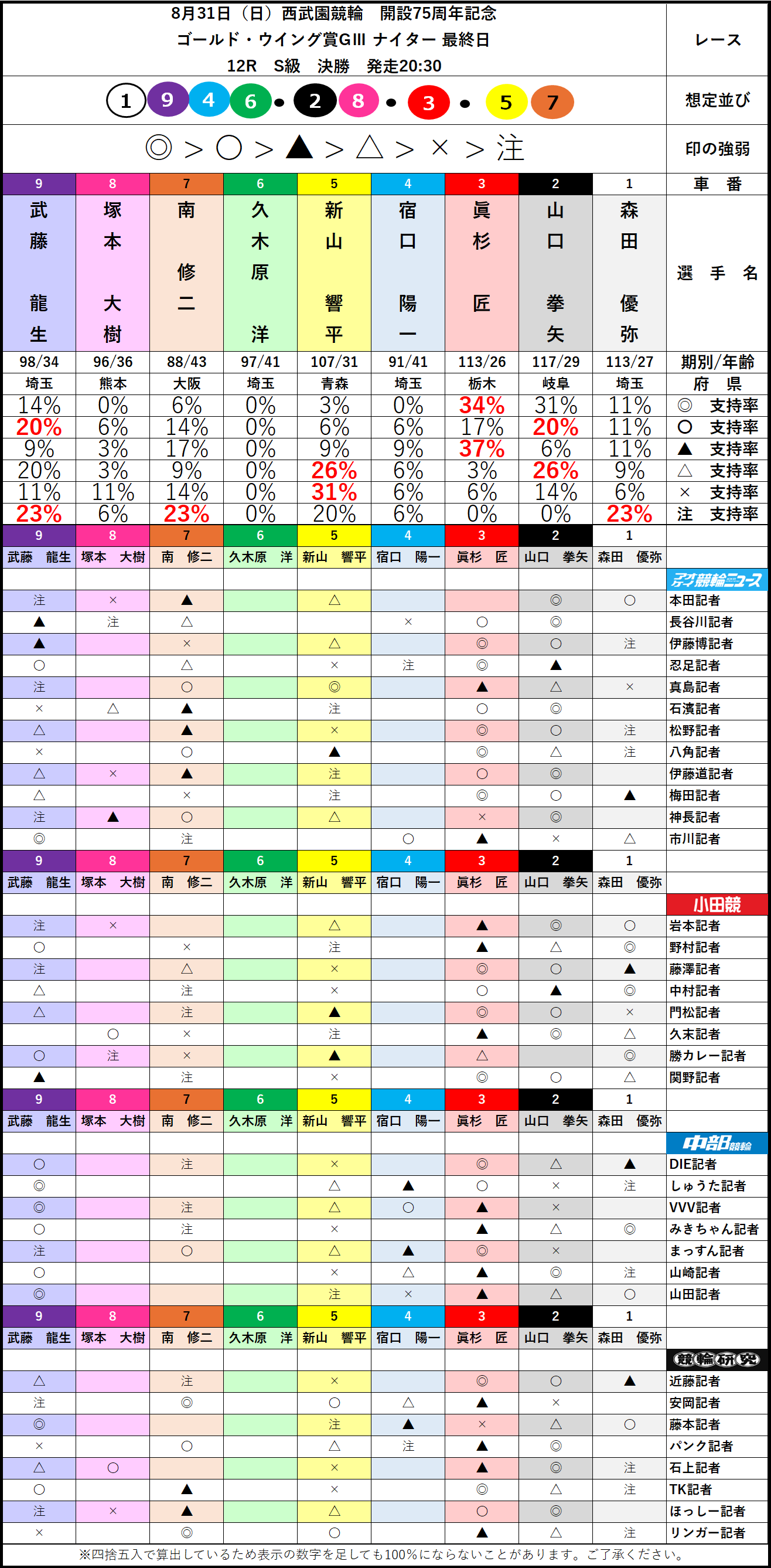 かなりデキは良さそうで中団確保から流れを見つつ痛烈打を放って、立川、富山に続いて今年三度目のGⅢ制覇を目指す。準決勝の流れから⑧塚本大樹がマークも、こちらはあまり支持が集まらず。