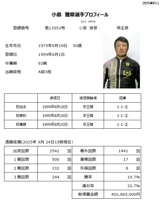 小島 雅章(こじま まさあき)選手(埼玉・83期)は、昨日(9/23)岐阜競輪場(FⅡ・ナイター)第1レースにおいて、1着となり、デビューからの通算勝利数500勝を達成しました。小島選手の通算500勝達成は、浦山 一栄選手(東京・72期)以来通算66人目(男子選手では61人目)の記録です。