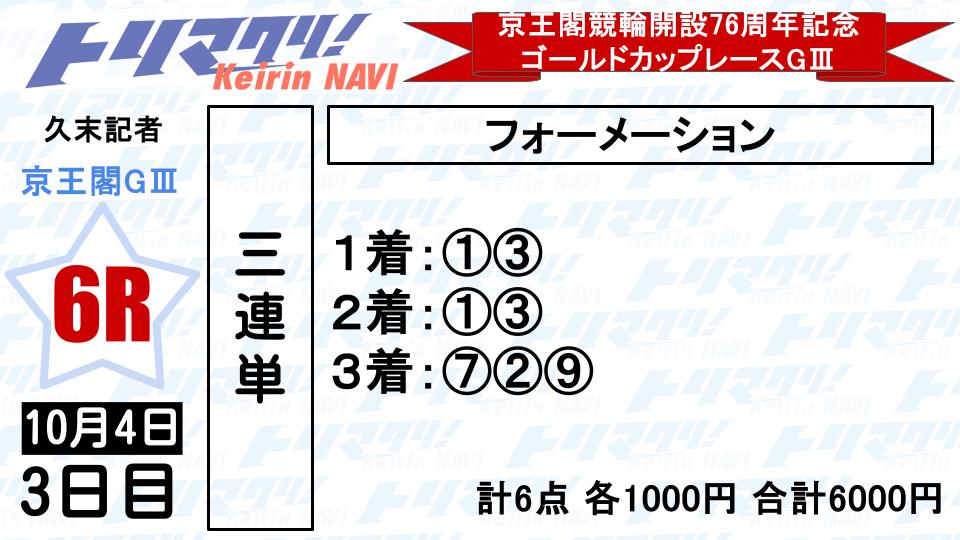 前に出る力では圧倒的に⑤山口だが三番手の④阿久津まで付いて来れるか難しいところ。ここは離れてしまうとみて、三番手に③小川がおさまって、前の①河合との直線勝負から狙ってみる。三着は小川マークの⑦山本と捲り追い込みで迫る長崎コンビの②平尾と⑨阪本へ。