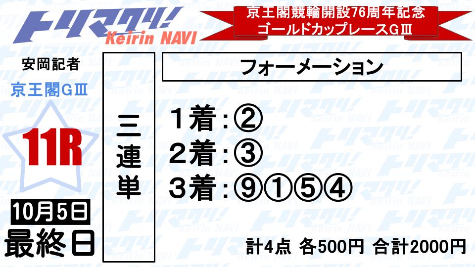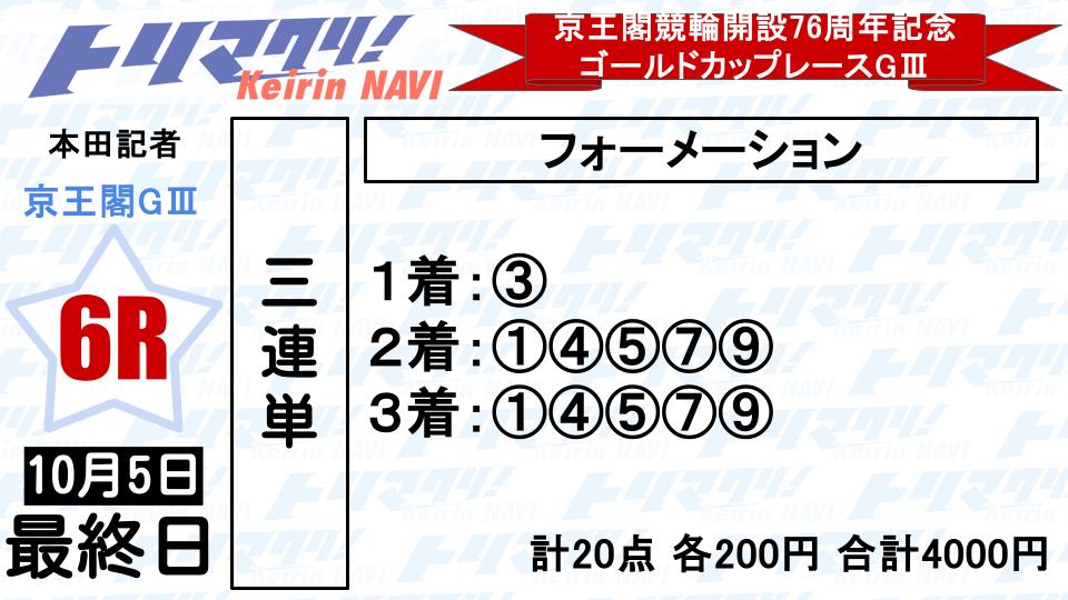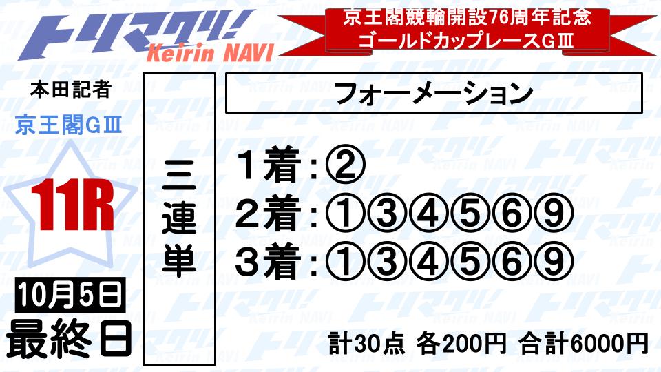 3日目は目標を与えられて何とか勝ったS班の③清水裕。状態がいいとは思えないし、自力でやるなら魅力は半減。なら気持ち良い逃げで昨日勝利した⑥福田稔。今日も無欲の逃走に出れば、番手有利に地元の②高橋築が抜け出し勝利。初日もワンツー決めたしね!!ただ相手は強化された特別優秀。⑥福田が2着に残れるとは限らない。いや残れないかも。よって、こちらも次位は広げます!