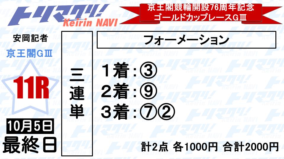 正直言って一長一短あるメンバー構成で意外と難解。①月森亮の捲りは買いやすいけど、捲りは展開次第だし、ポカもある。よって狙うは③石塚輪。初日の捲りが鮮やかだったし、ここはカマシ捲りで勝つ競走。⑦三谷政が続くが前回落車の影響がありそうな今開催。よって次位は広げます!