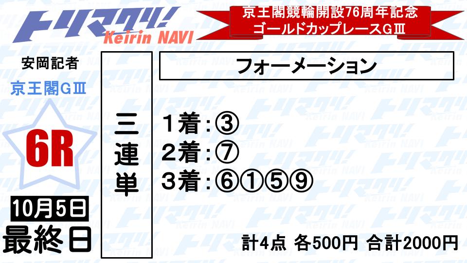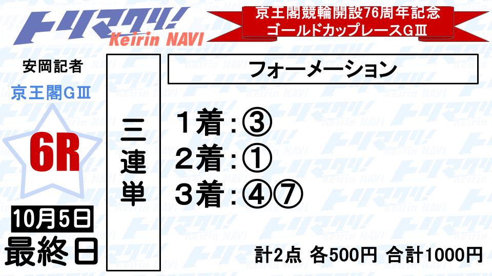 【6R S級 選抜】 ③石塚は最終日、この格のレースとなったが、脚勢は悪くない。好機の快速ショット炸裂させて再勝だ。 3-7-6159 4点を500円ずつ 計2000円。3-1-47 2点を500円ずつ 計1000円。