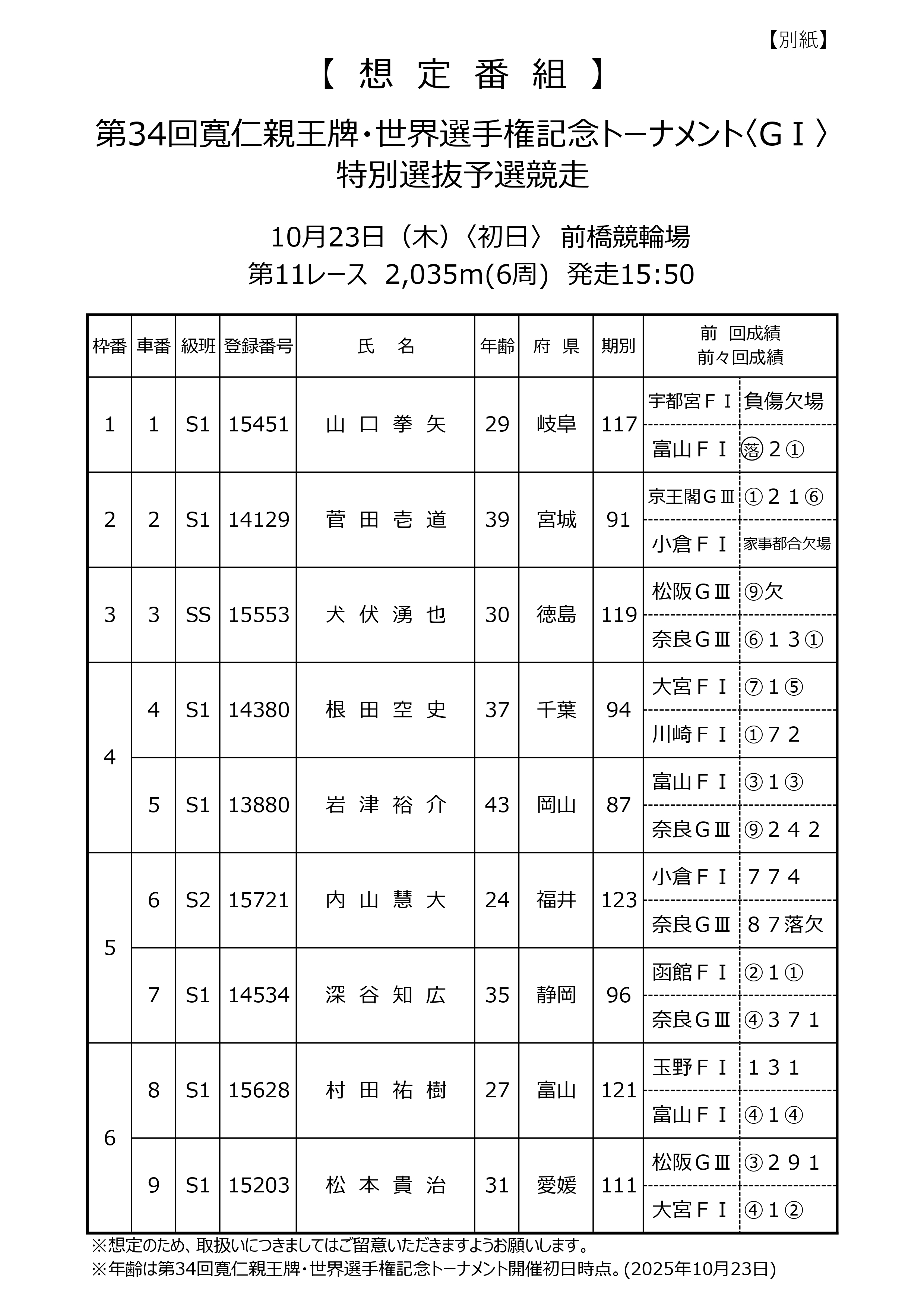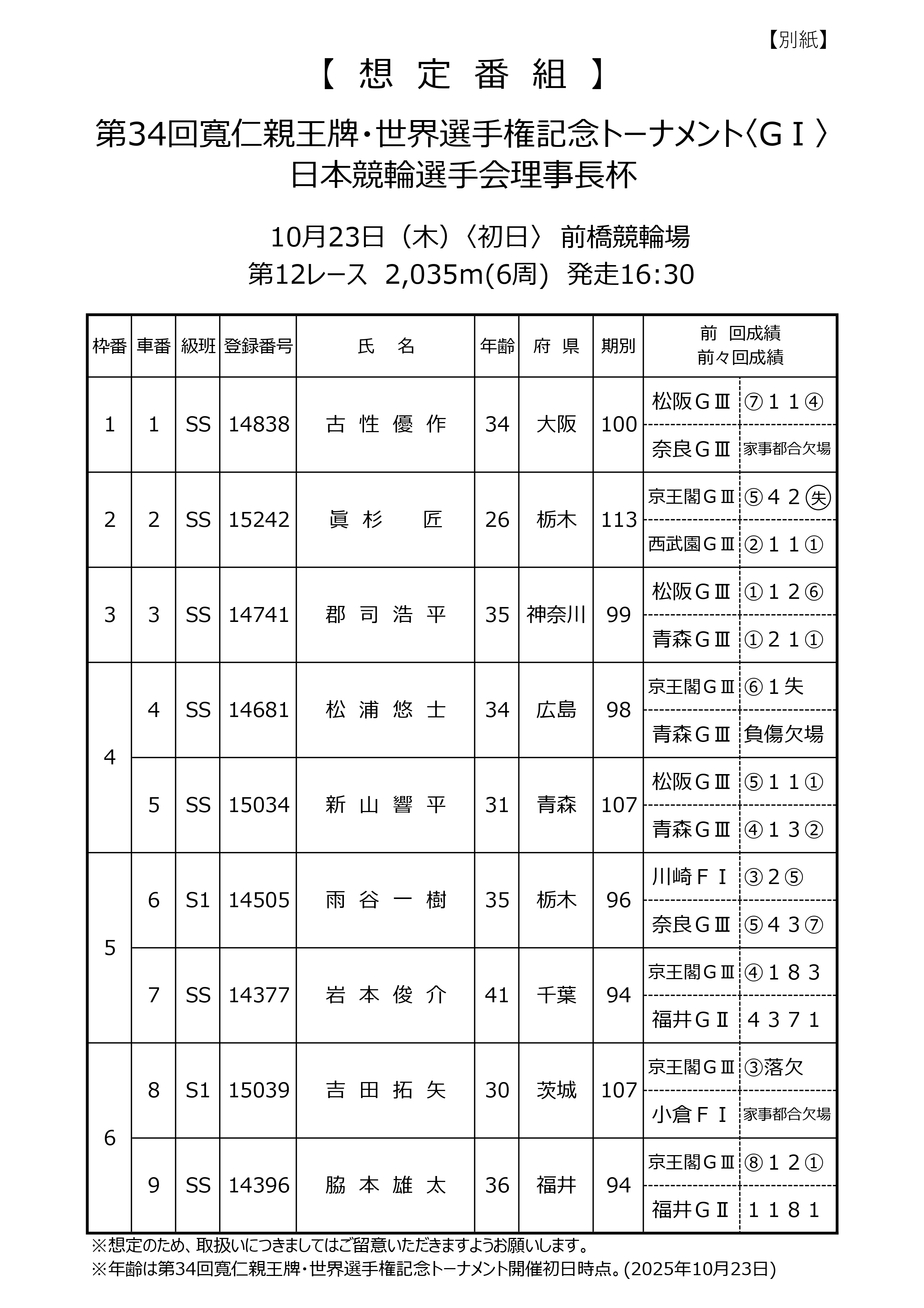 10月23日(木)から26日(日)までの4日間、前橋競輪場において開催される「第34回寬仁親王牌・世界選手権記念トーナメント」の「日本競輪選手会理事長杯(初日・第12レース)」及び「特別選抜予選競走(初日・第10・11レース)」の想定番組が、別紙のとおりとなりましたので、お知らせいたします。