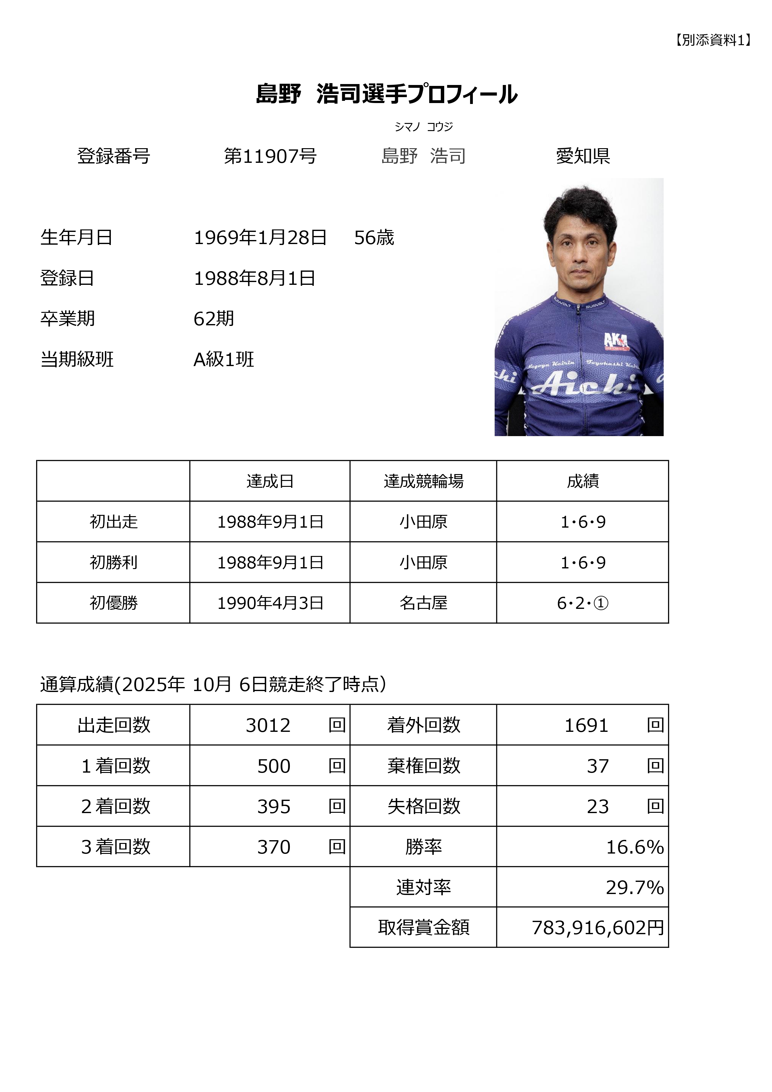 島野 浩司(しまの こうじ)選手(愛知・62期)は、本日(10/6)弥彦競輪場(FⅠ)第3レース『A級予選競走』において1着となり、デビューからの通算勝利数500勝を達成しました。島野選手の通算500勝達成は、小島 雅章選手(埼玉・83期)以来通算67人目(男子選手では62人目)の記録です。