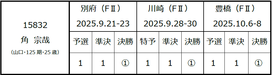 角 宗哉(かど ひろや)選手〔山口・125期〕が2025年10月6日から開催されておりました、豊橋競輪(FⅡ・ミッドナイト)の開催において3日間連続1着となり、3場所連続完全優勝を達成し、本日(10月9日)付で『S級2班』へ特別昇級いたしますので、お知らせいたします。