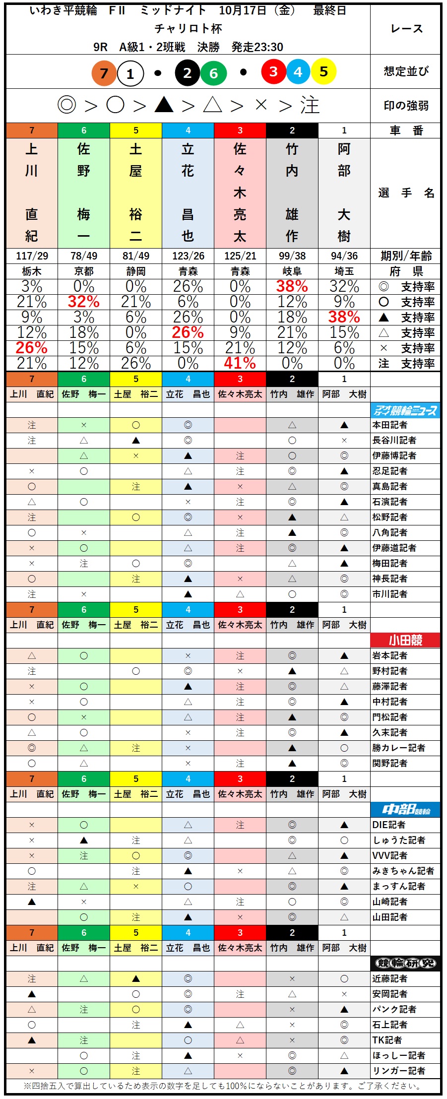 △支持率トップの26%は④立花昌也。同県の後輩、③佐々木亮太を使えるのは大きい。逃げてくれればシビアに番手捲りを放つだろう。①阿部、②竹内の2強を破る態勢は整った!