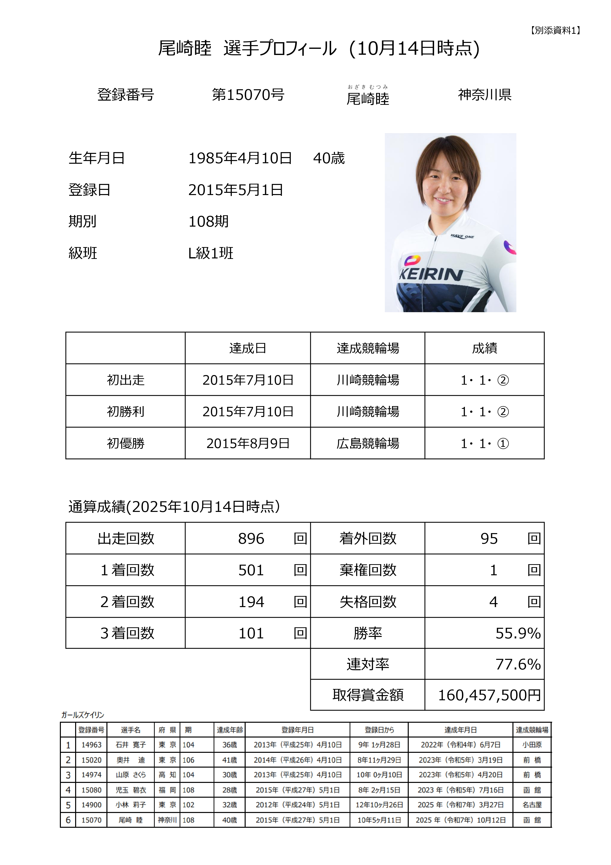 尾崎睦選手(神奈川・108期)は一昨日(10/12)函館競輪場(FⅠ・ナイター)第7レース『L級ガールズ予選(第2走)』において、1着となり、デビューからの通算勝利数500勝を達成しました。尾崎選手の通算500勝達成は、小林莉子選手(東京・102期)以来、ガールズケイリンで6人目の記録です。