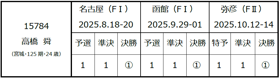 高橋 舜(たかはし しゅん)選手〔宮城・125期〕が2025年10月12日から開催されておりました、弥彦競輪(FⅡ・ミッドナイト)の開催において3日間連続1着となり、3場所連続完全優勝を達成し、本日(10月15日)付で『S級2班』へ特別昇級いたしますので、お知らせいたします。