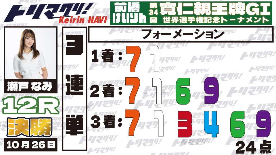 中国勢と別線での戦いとなった③清水裕友SS班を死守出来るかの瀬戸際で出切れば優勝、一つでも上位着が欲しいところ。親王牌と相性抜群の⑧河端朋之連れて一撃を狙う。
