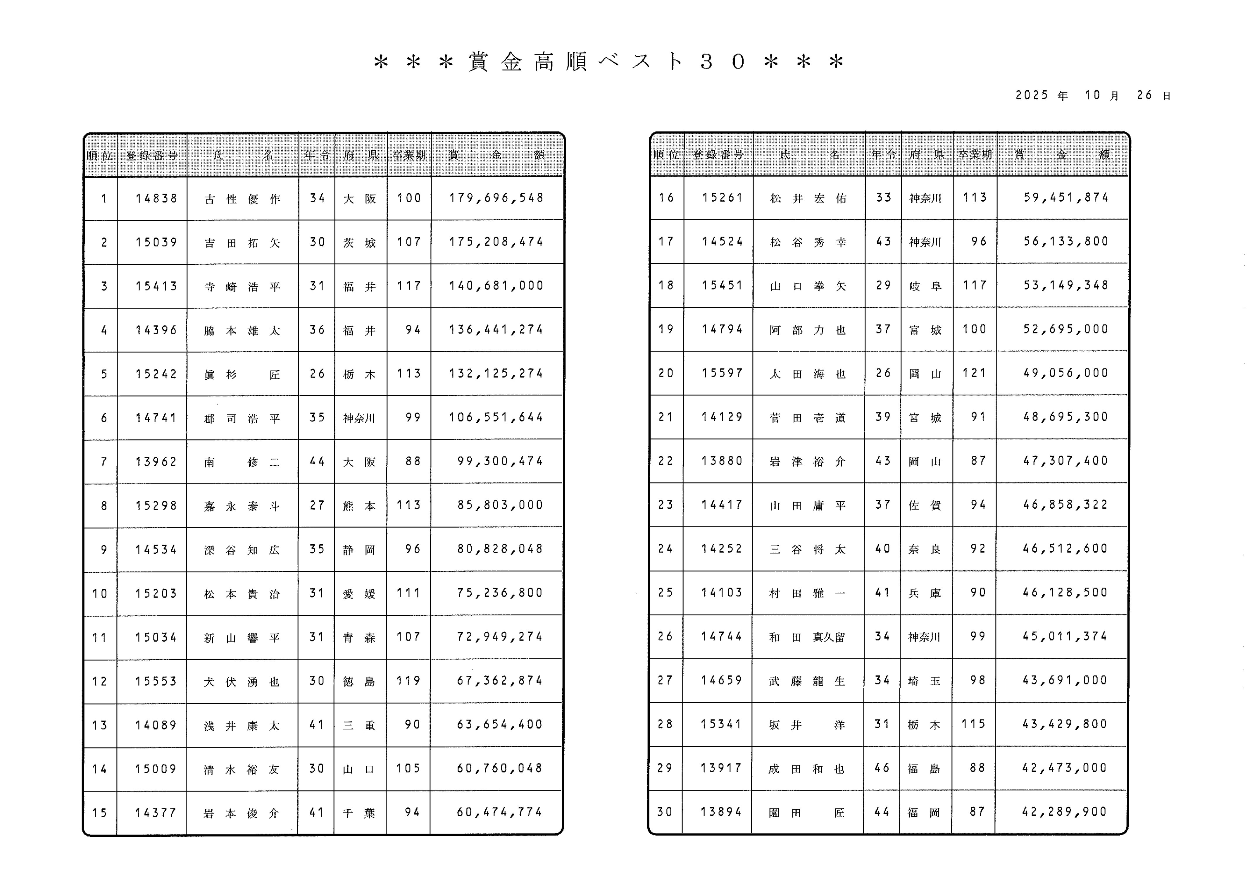 第34回寬仁親王牌 世界選手権記念トーナメント(10月26日 同開催決勝戦終了時)の賞金高順ベスト30は、別添のとおりとなります。