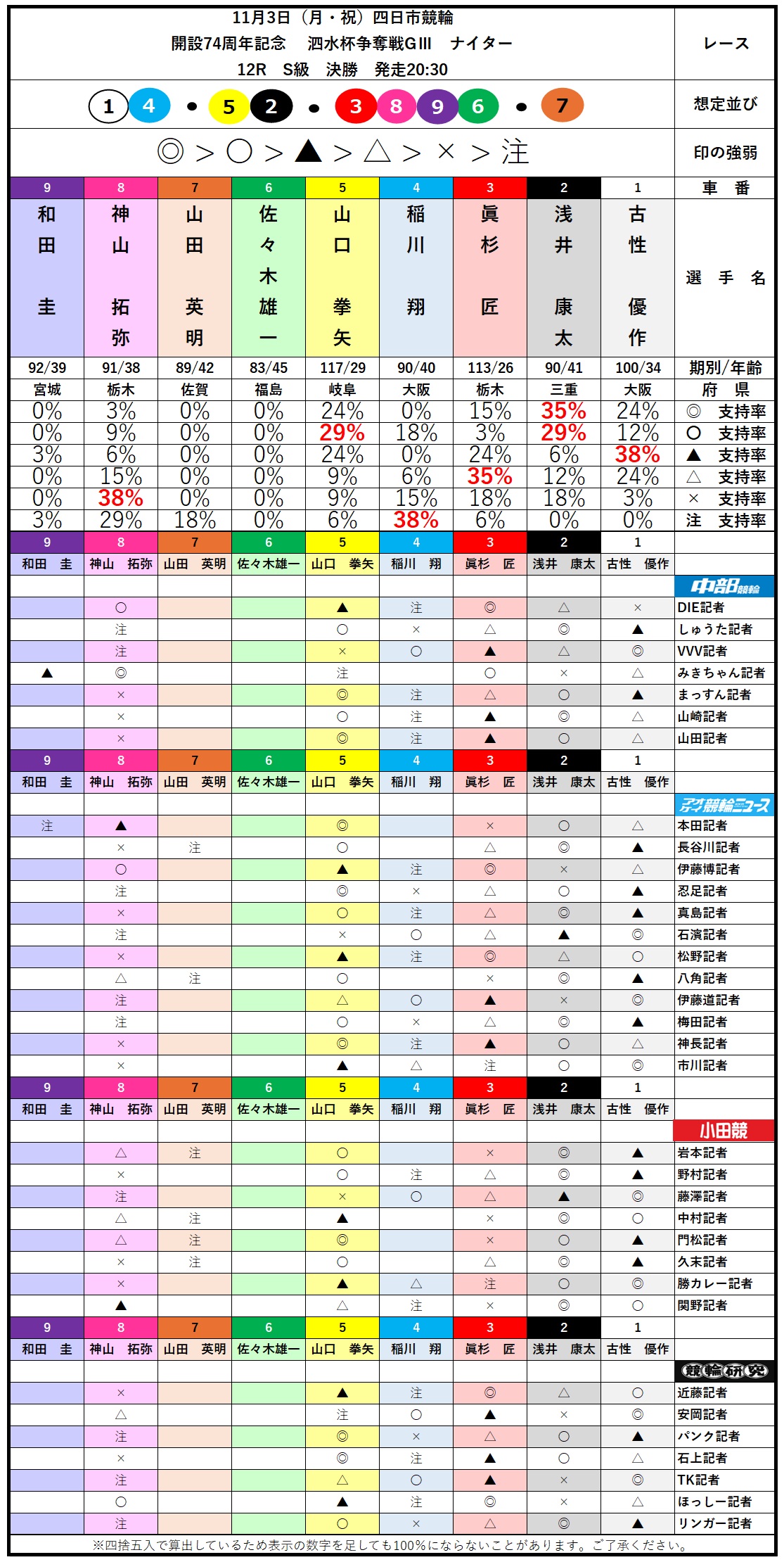 支持は割れたがその2名より記者の人気を集めたのは◎支持率35%でトップの②浅井康太だ。中部コンビはデキがよく、⑤山口拳矢が捲って、最後は地元の②浅井が逆転するという考えで評価されたようだ。②浅井は〇でも29%の支持を得ている。