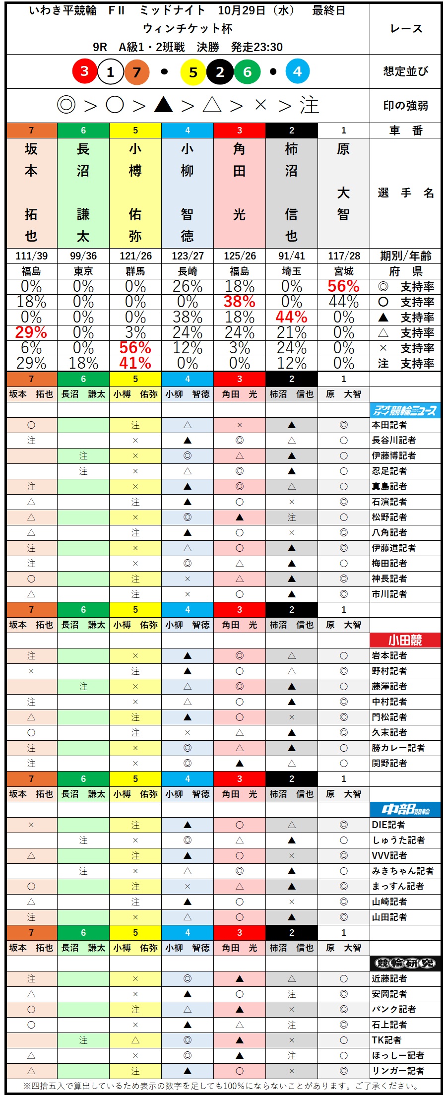 〇支持率トップは38%の③角田。地元戦で逃げ切り連発と確実に仕上がっています。後ろが自力兼備の①原だけに本命の座を譲った形ですが、押し切れるだけの力は十分にあるといえます。