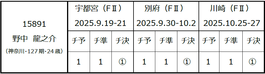 野中 龍之介(のなか りゅうのすけ)選手〔神奈川・127期〕が2025年10月25日から開催されておりました、川崎競輪(FⅡ・ナイター)の開催において3日間連続1着となり、特別昇班の対象となる開催を3場所連続完全優勝し、本日(10月28日)付で『A級2班』へ特別昇班いたしますので、お知らせいたします。