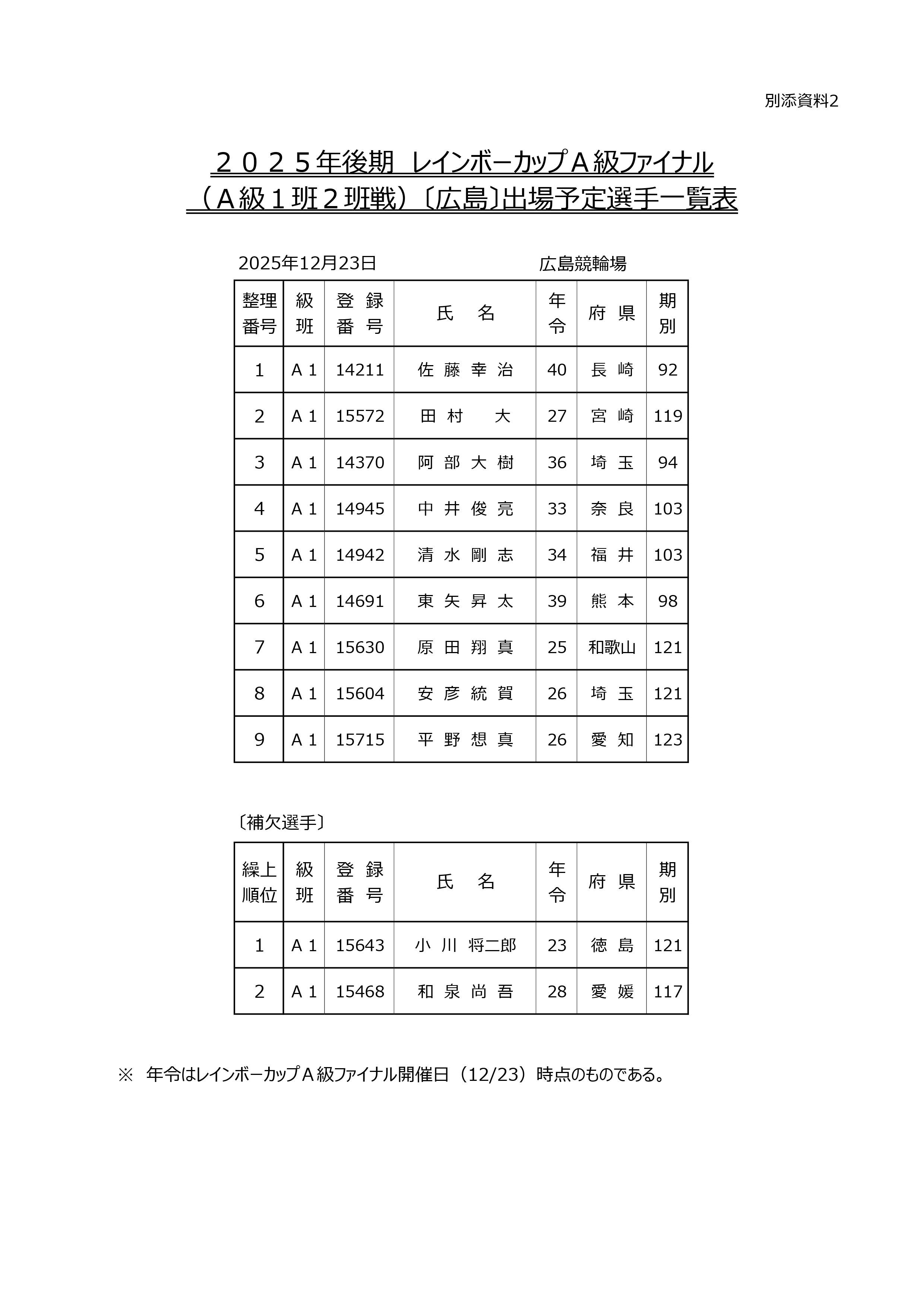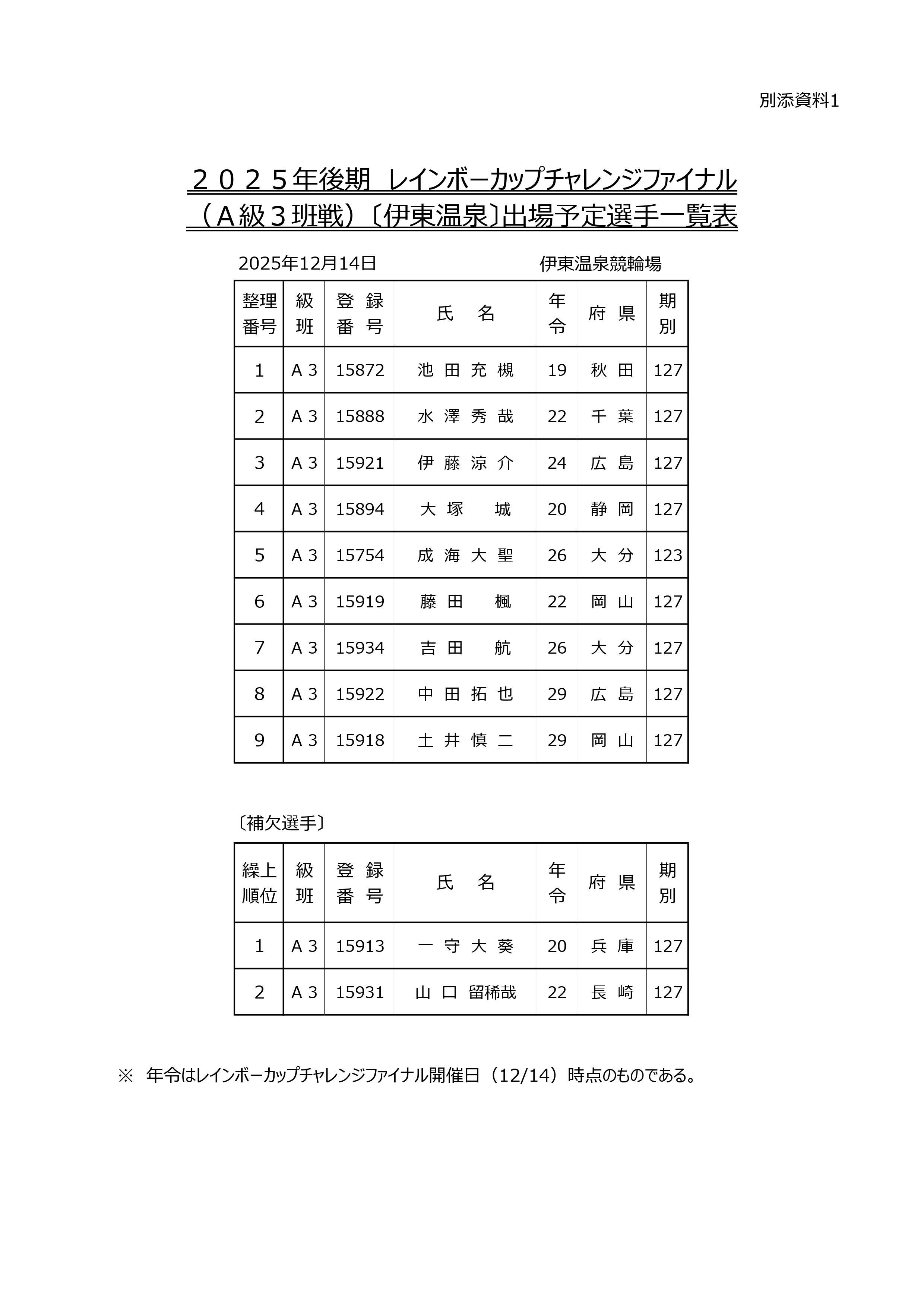 2025年後期レインボーカップの出場予定選手が決定しましたので、別添のとおりお知らせいたします。