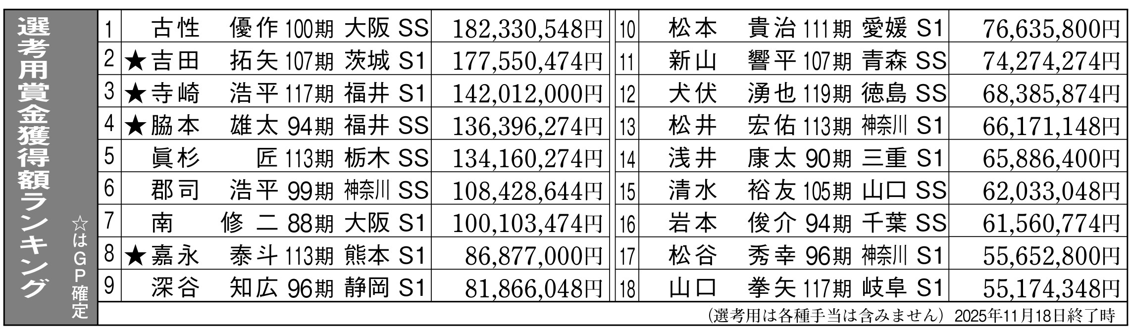 また、賞金ランキングも掲載しますので、合わせてご確認ください。