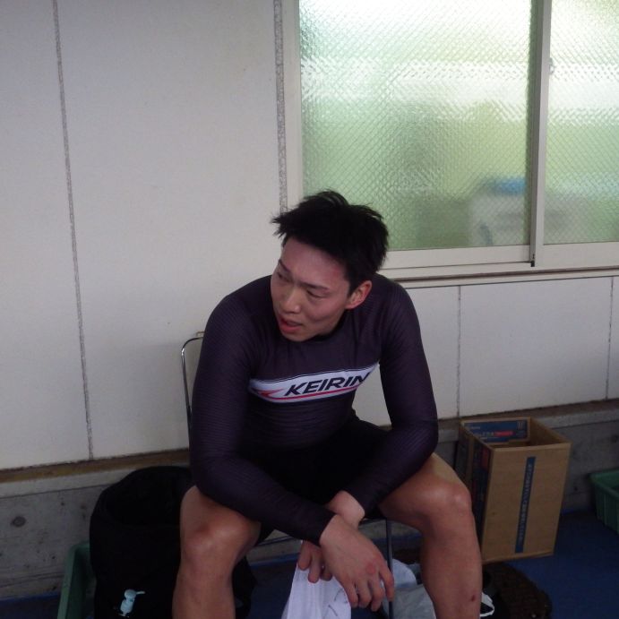 ⑦稲毛知也 「みんなに牽制されてキツかったっすね。もういつものパターンでダメかなって思ったら、意外と行けた。何とか踏めていますね。欲を言えば走り方、走る場所をどうにかしたい。もっとスレスレを行ければ距離も短くなるし、風も受けない。それはバンク練習が出来るようになったらやってみます。僕も自力で。」