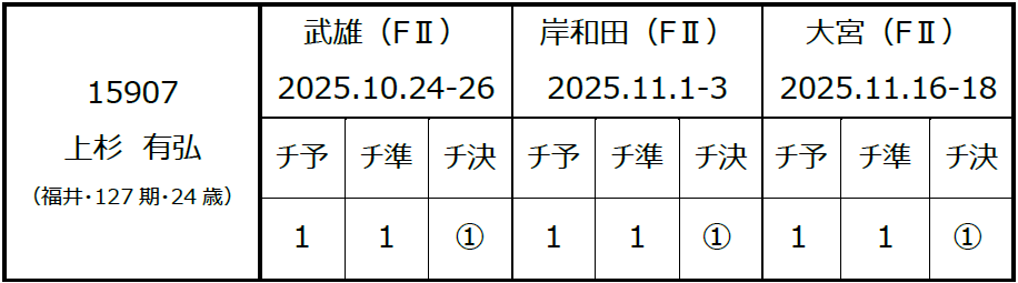 上杉 有弘(うえすぎ ともひろ)選手〔福井・127期〕が2025年11月16日から開催されております、大宮競輪(FⅡ)の開催において3日間連続1着となり、特別昇班の対象となる開催を3場所連続完全優勝し、明日(11月19日)付で『A級2班』へ特別昇班いたしますので、お知らせいたします。