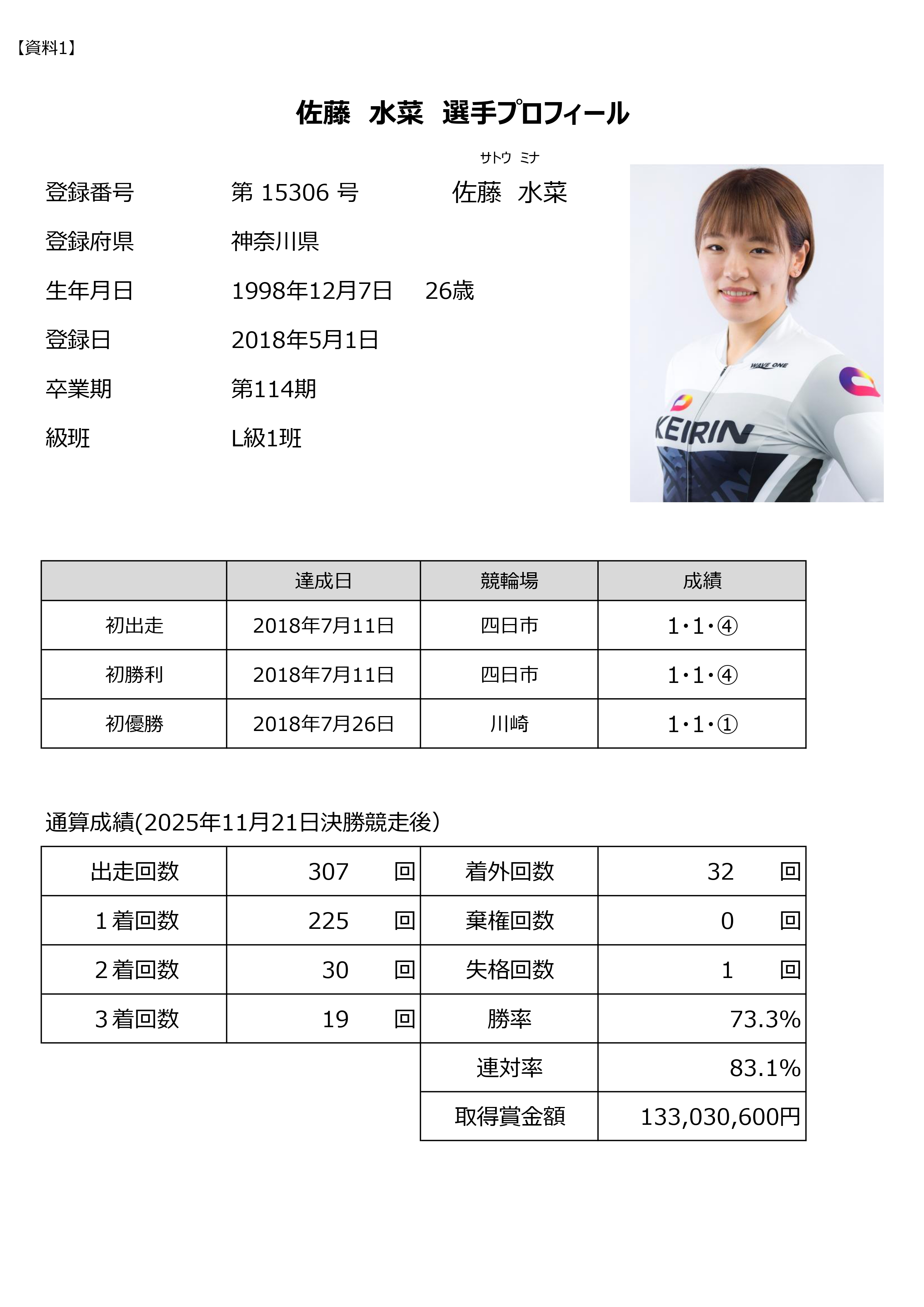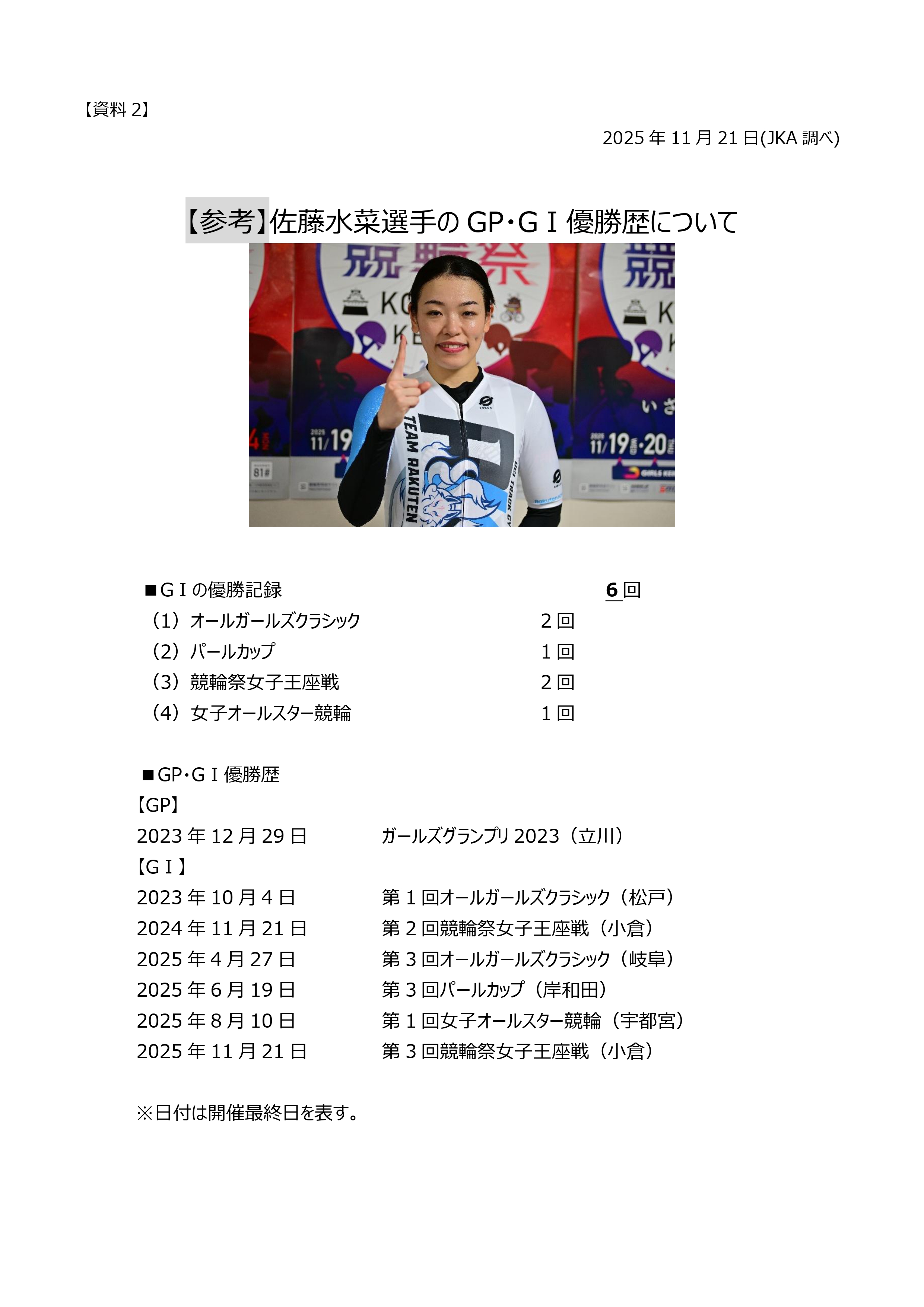 11月21日小倉競輪場において行われた『第3回競輪祭女子王座戦(GⅠ)』の優勝において、佐藤水菜選手(神奈川・114期・26歳)は自身の持つガールズケイリンにおけるGⅠ優勝記録を「6回」に更新しましたので、お知らせいたします。なお、佐藤選手は『競輪に係る業務の方法に関する規程』第100条に基づき後日公益財団法人JKAより表彰を行う予定です。