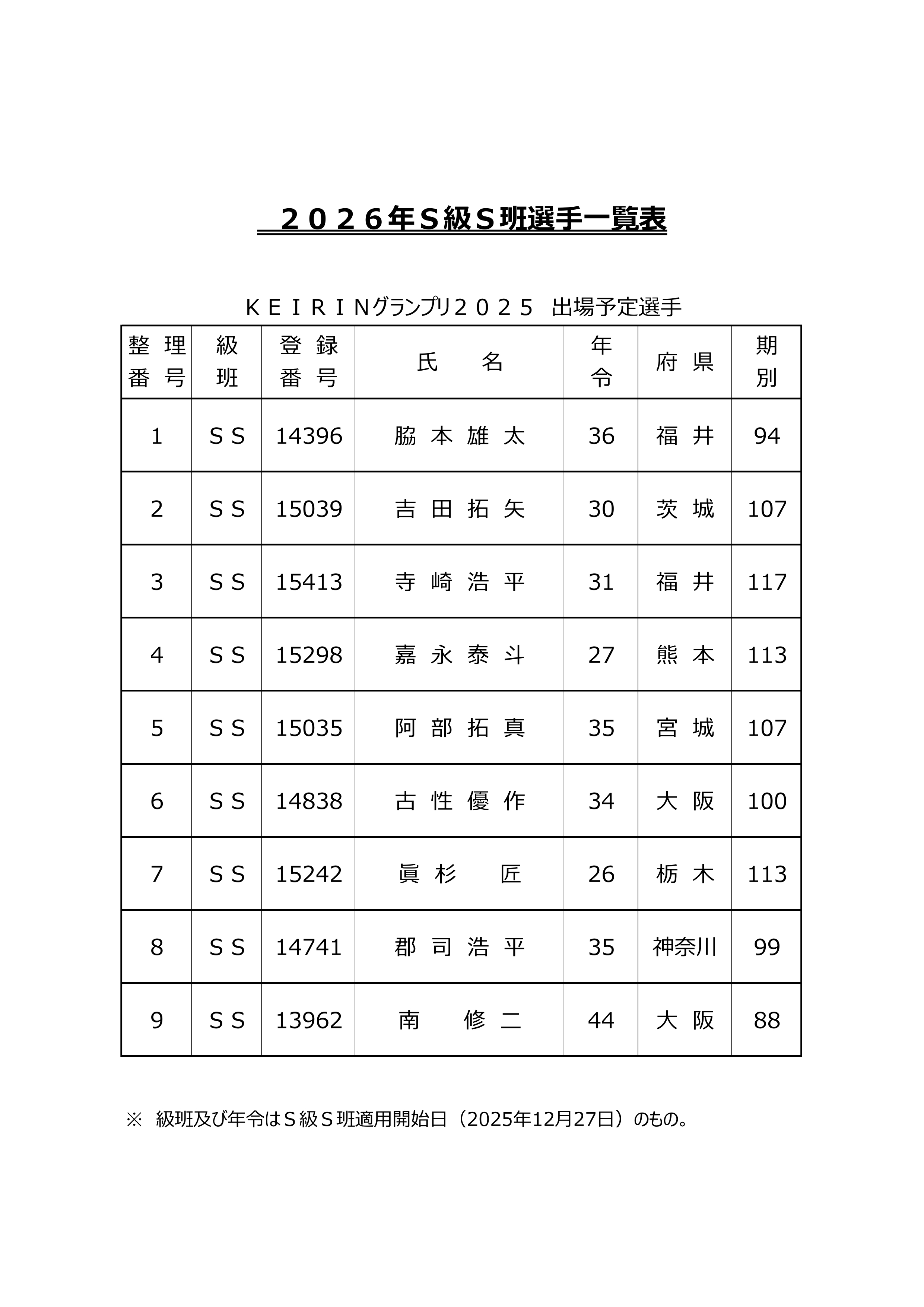 2026年S級S班選手が決定しましたのでお知らせいたします。