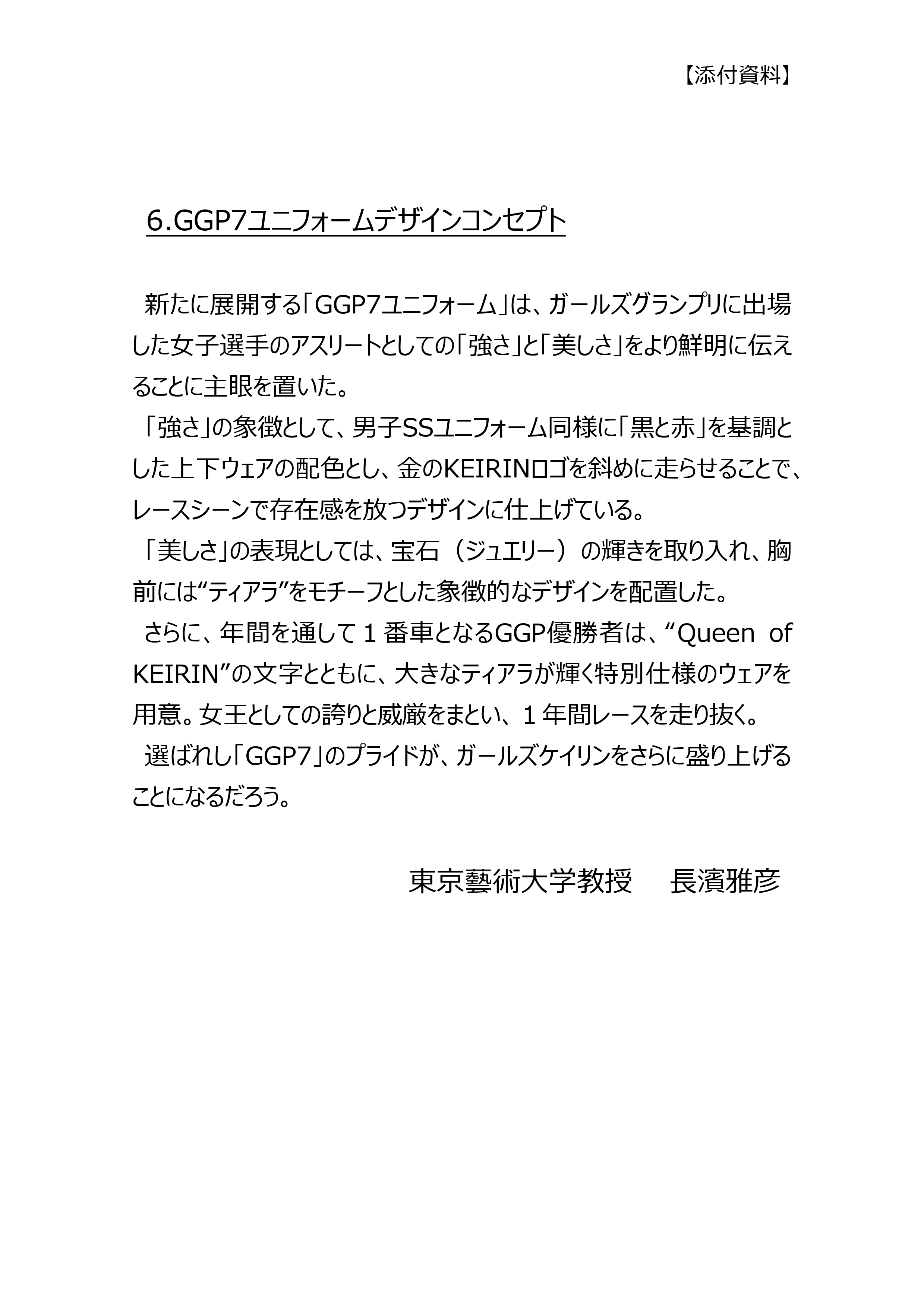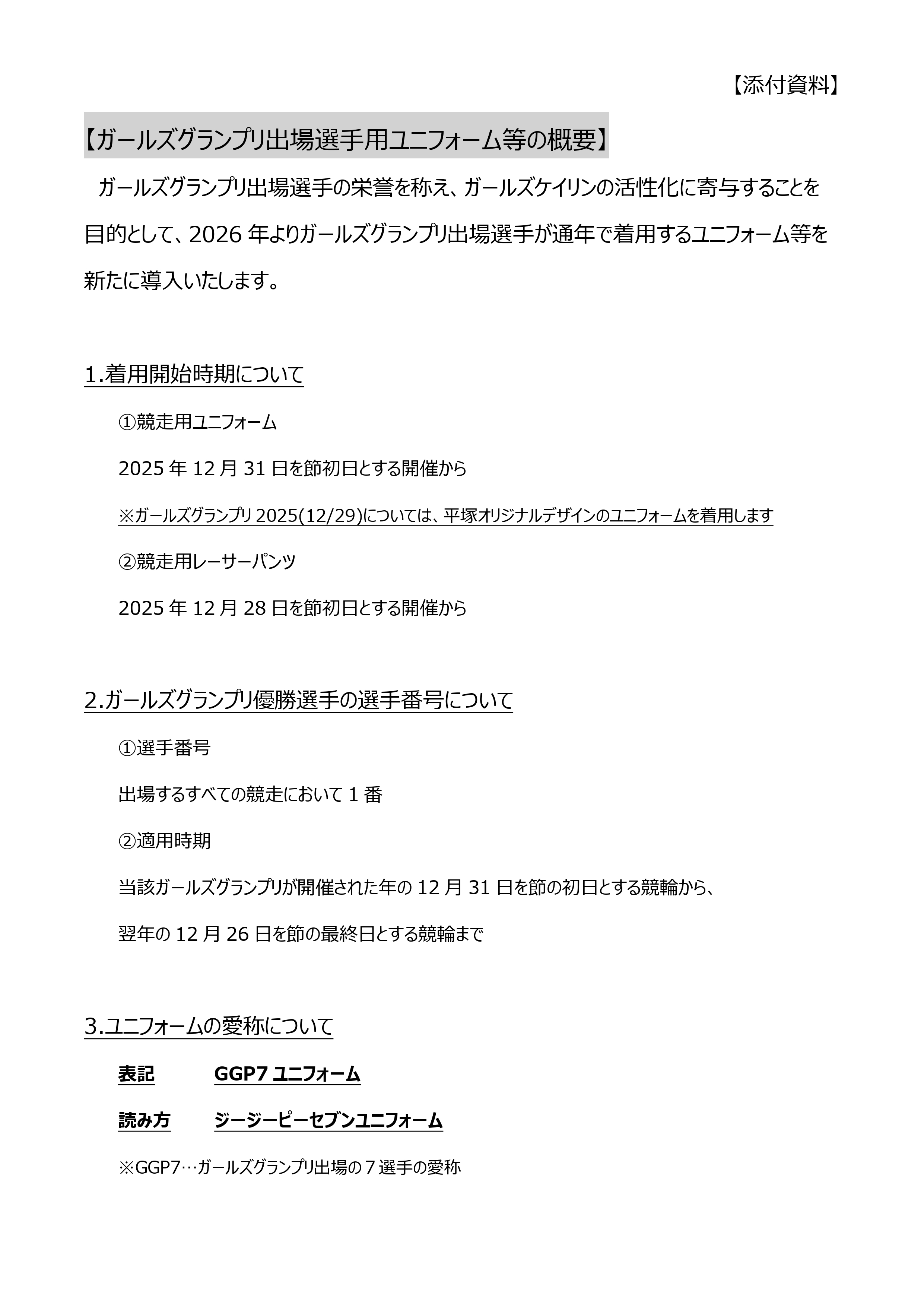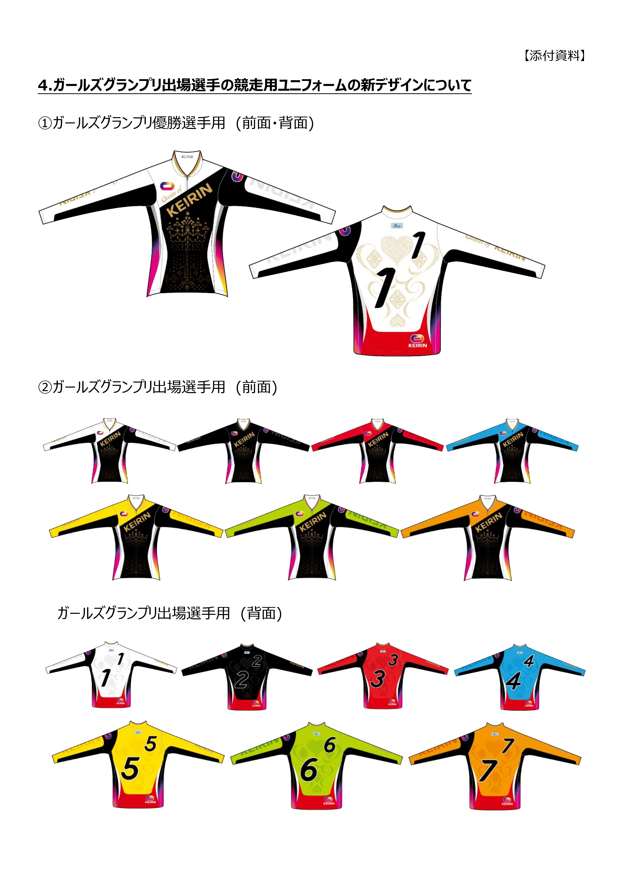 2026年よりガールズグランプリ出場選手が着用するユニフォームの新デザインが決定しましたので、お知らせいたします。詳細は、添付資料をご覧ください。記事掲載等、お取り計らいのほどよろしくお願いいたします。