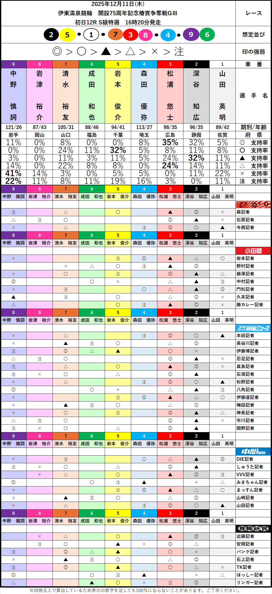 対して○対抗の支持率は⑤岩本俊介が32%を集める形になったが、これは◎本命が②深谷の時には⑤岩本がセットに対し、◎本命が③松浦の時には○対抗が割れた結果だろう。