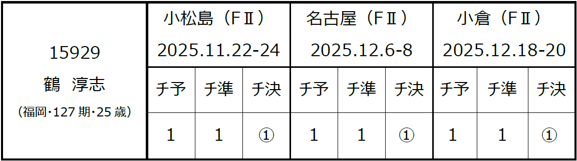 鶴 淳志 (つる あつし)選手〔福岡・127期〕が2025年12月18日から開催されておりました、小倉競輪(FⅡ・ナイター)の開催において3日間連続1着となり、3場所連続完全優勝を達成し、昨日2025年12月21日付で『A級2班』へ特別昇班いたしましたので、お知らせいたします。