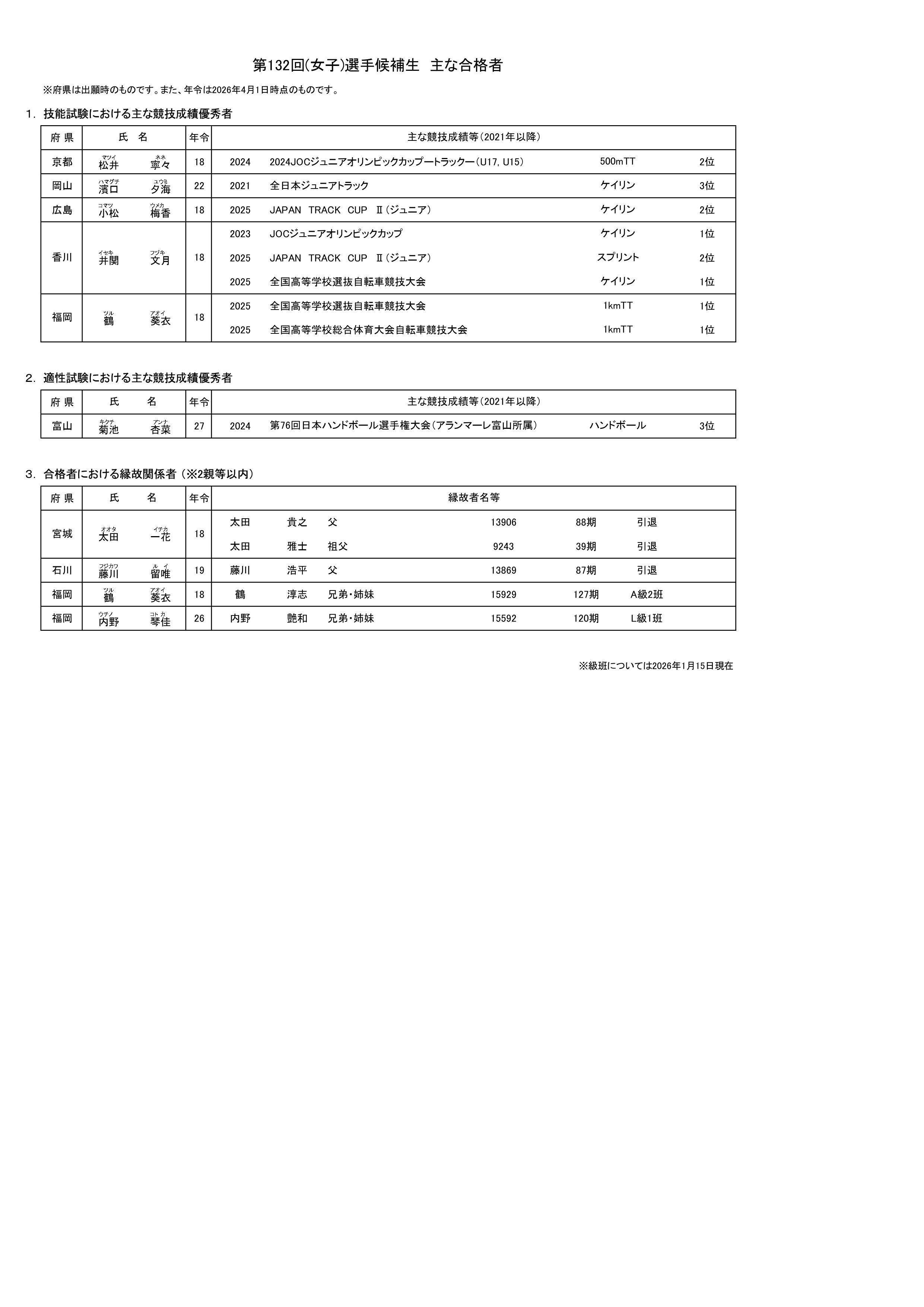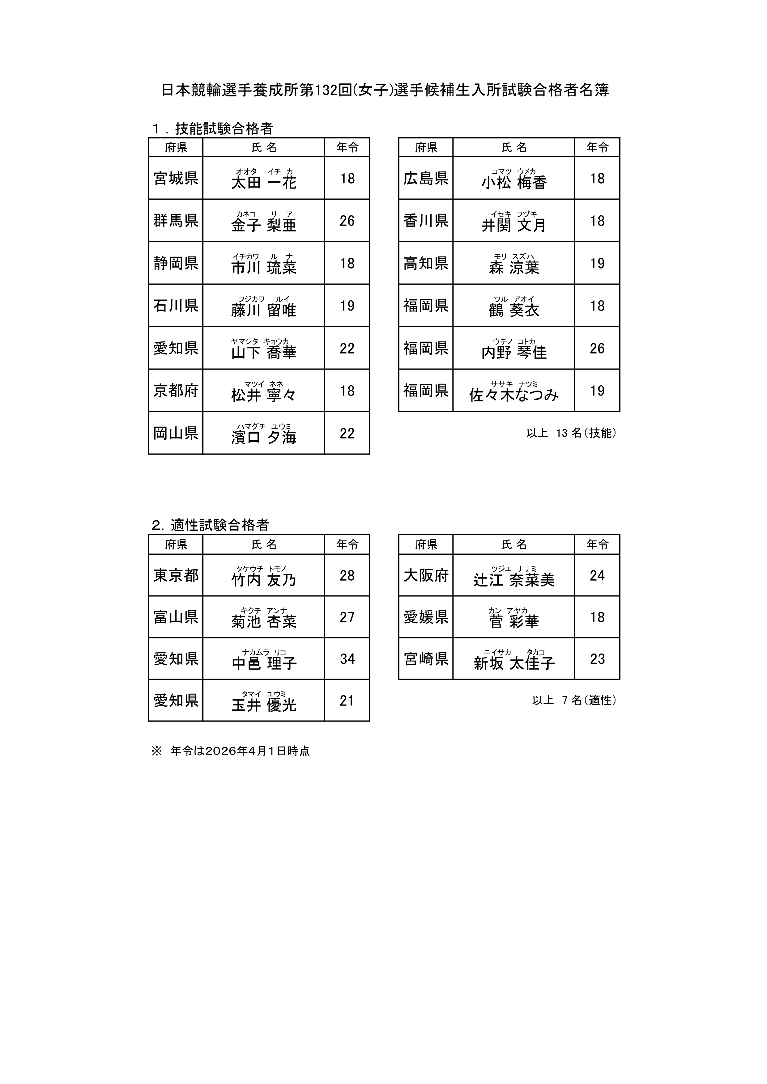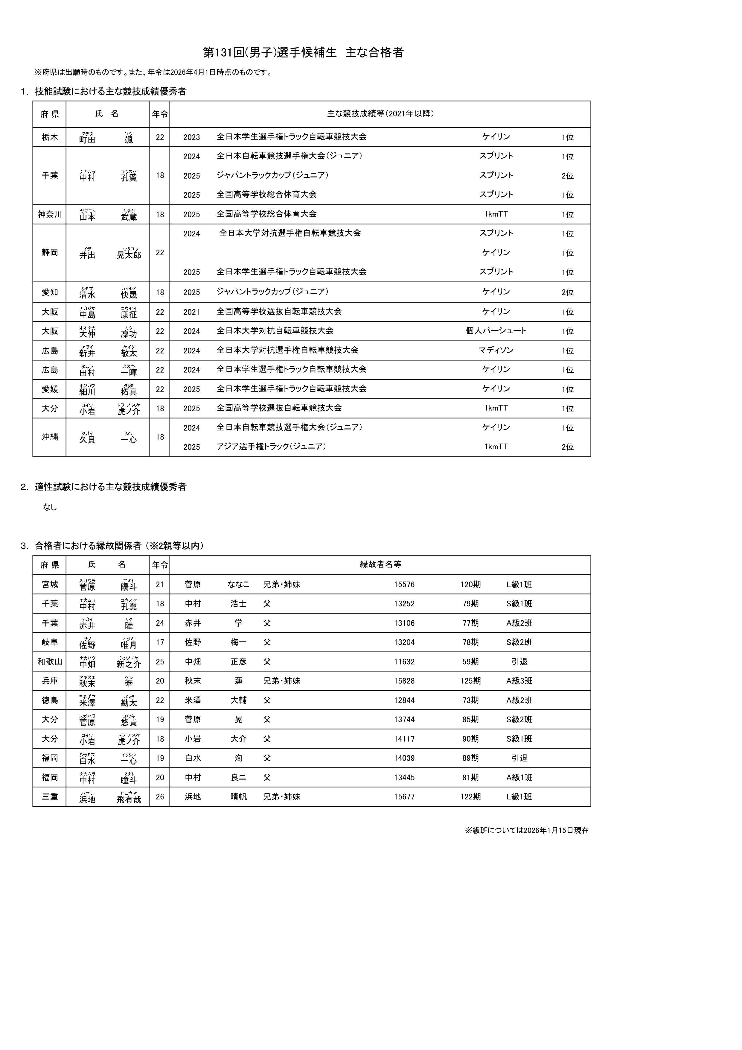 日本競輪選手養成所入所試験委員会(以下、入試委員会)委員長 神山雄一郎(カミヤマユウイチロウ)は、本日、入試委員会を開催し、第131回(男子)及び第132回(女子)選手候補生一般試験の第2次試験結果をふまえ、2026年度入所予定の合格者を決定しましたのでお知らせいたします。合格者は、第131回(男子)選手候補生が72名、第132回(女子)選手候補生が20名です。