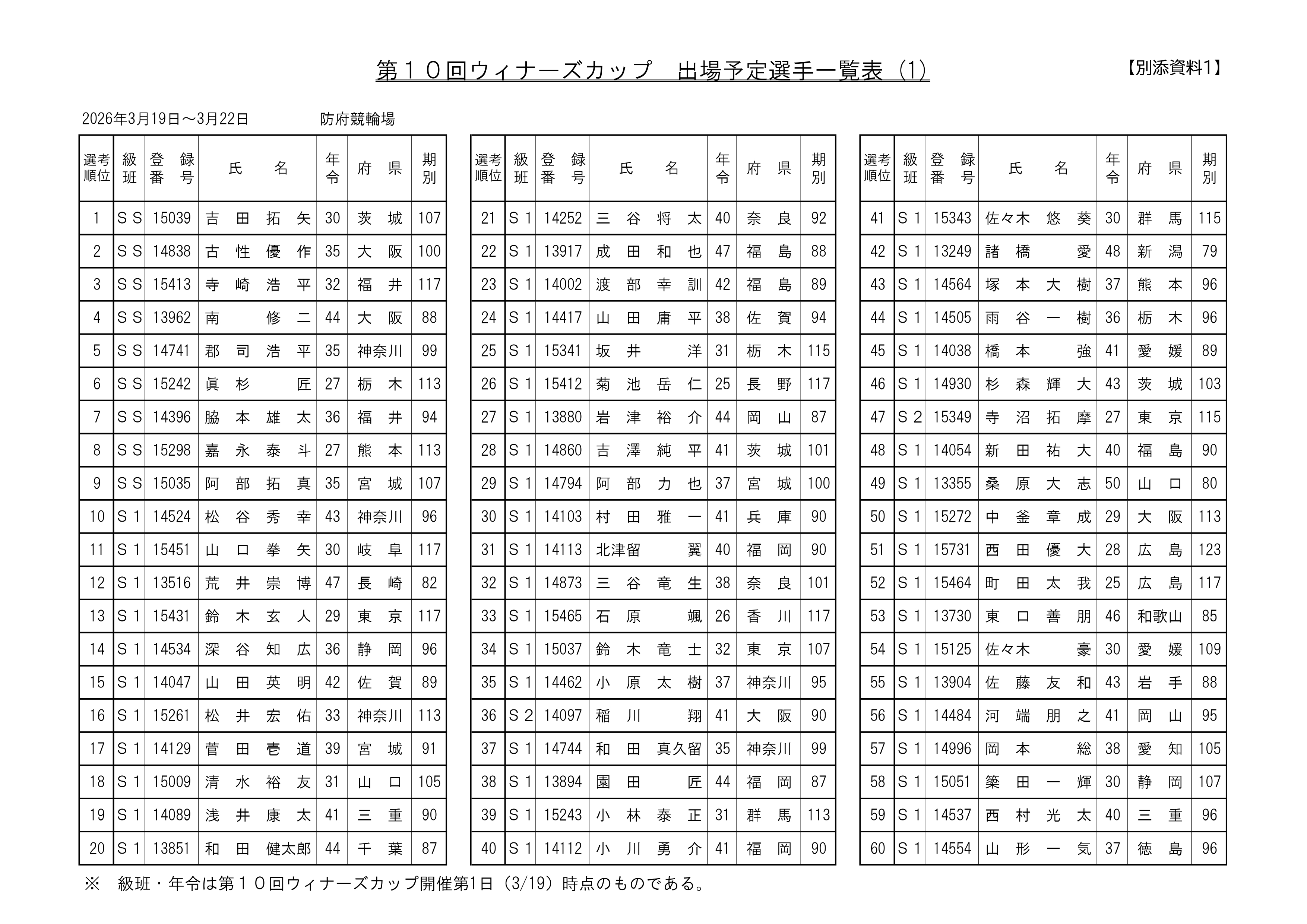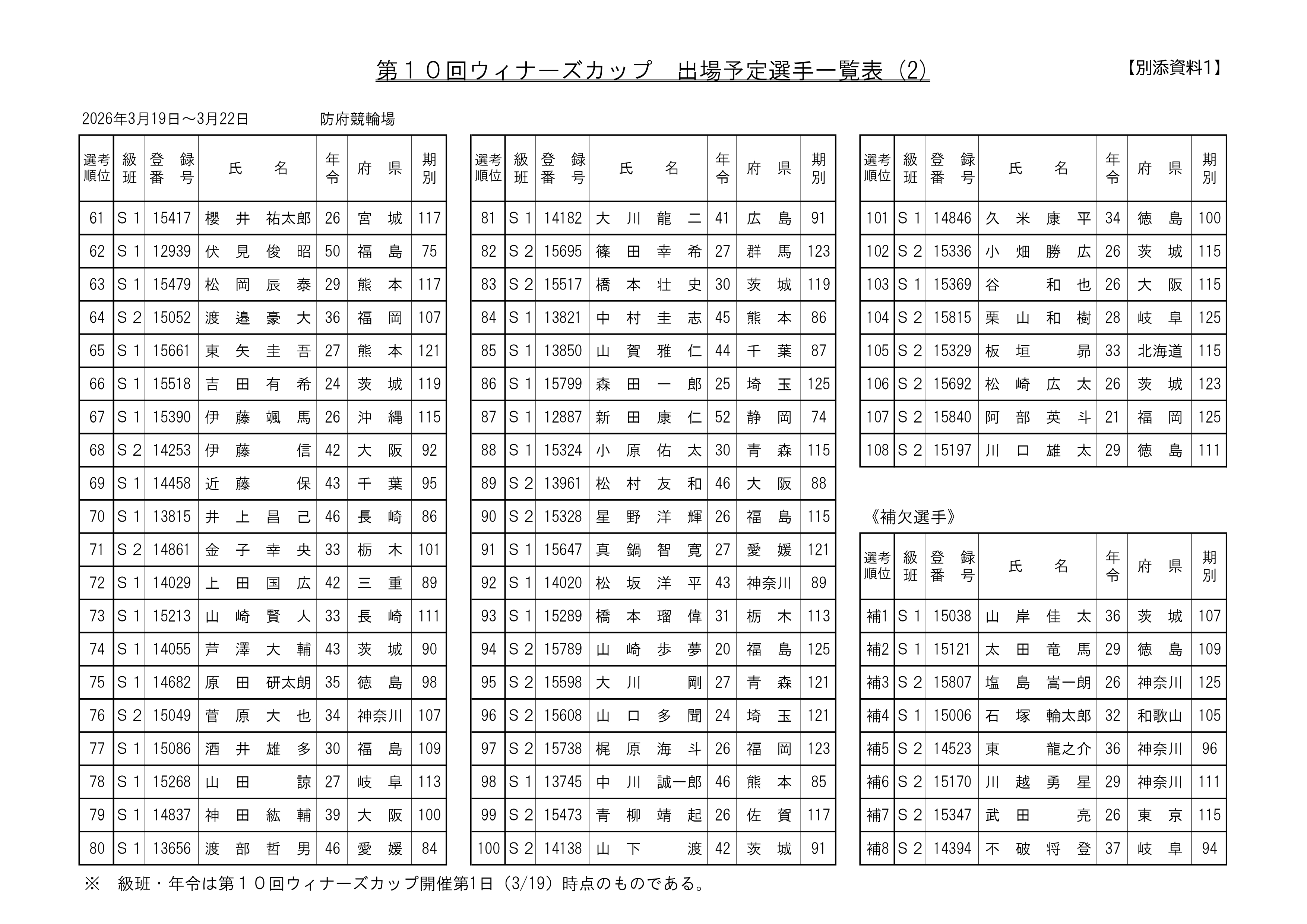 2026年3月19日(木)から22日(日)までの4日間、防府競輪場において開催される『第10回ウィナーズカップ』の出場予定選手が決定しましたので、お知らせいたします。