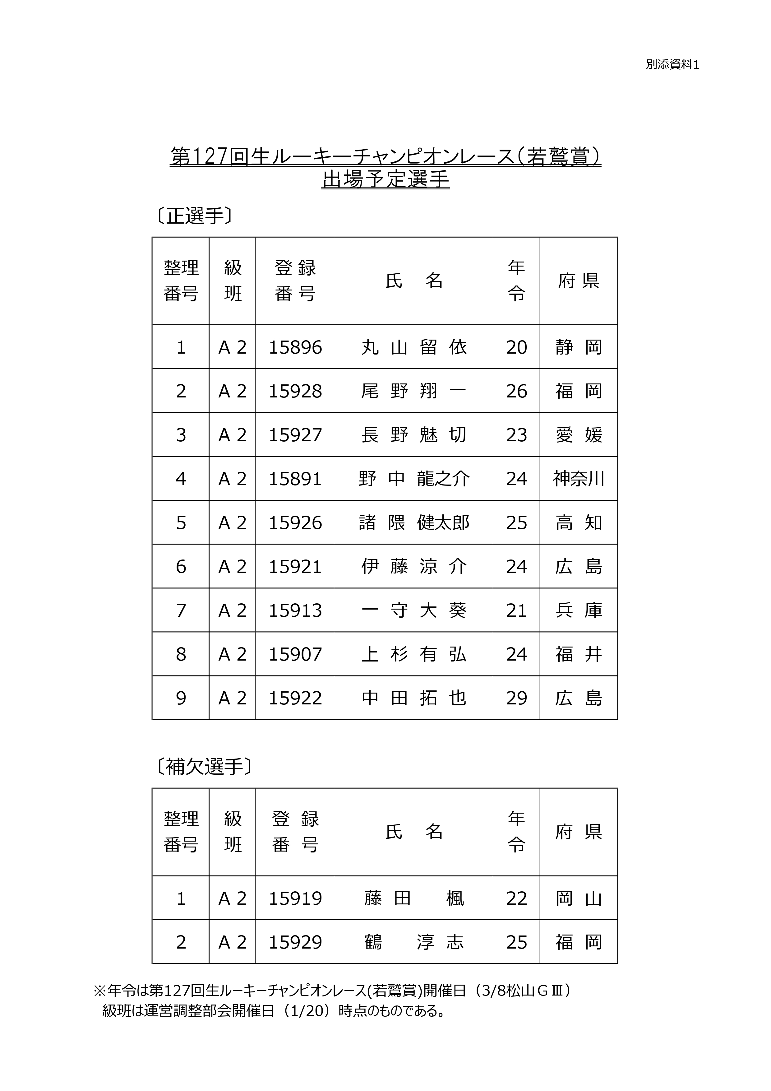 2026年3月8日(日)、松山競輪場第9レースにおいて開催される『第127回生ルーキーチャンピオンレース(若鷲賞)』の出場予定選手が決定しましたので、お知らせいたします。