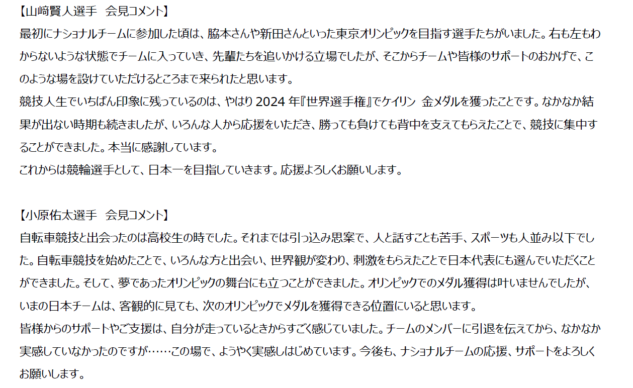 2025年12月31日をもって、本人の希望により山﨑賢人選手及び小原佑太選手が自転車トラック競技の強化指定選手から外れることになりました。両選手ともに、これからは競輪選手としての活動を続けていきます。12月22日都内にて、競技引退の記者会見を実施したため、両選手のコメントを下記にてお伝えさせていただきます。
