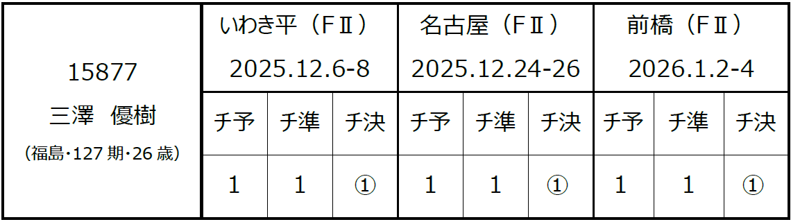 三澤 優樹 (みさわ ゆうき)選手〔福島・127期〕が2026年1月2日から開催されておりました、前橋競輪(FⅡ・ミッドナイト)の開催において3日間連続1着となり、3場所連続完全優勝を達成し、本日2026年1月5日付で『A級2班』へ特別昇班いたしますので、お知らせいたします。