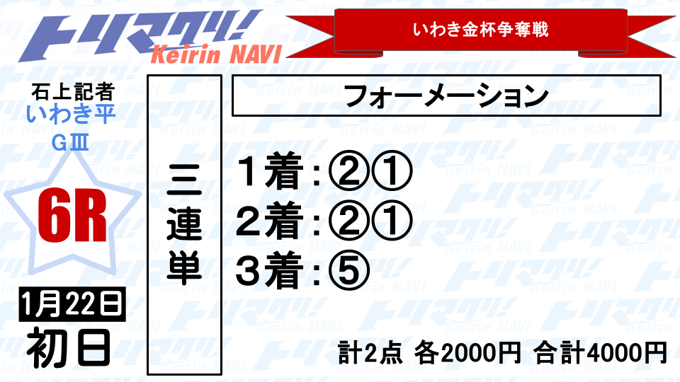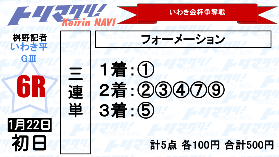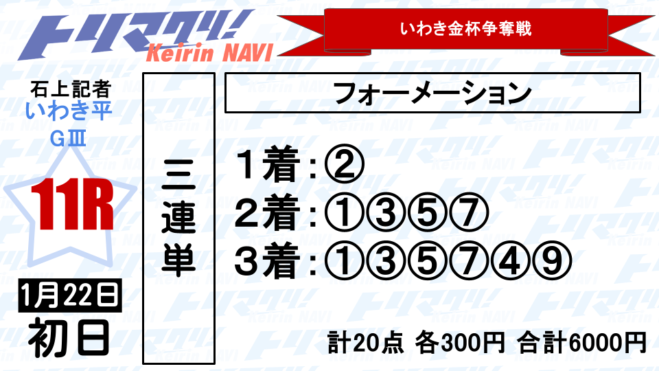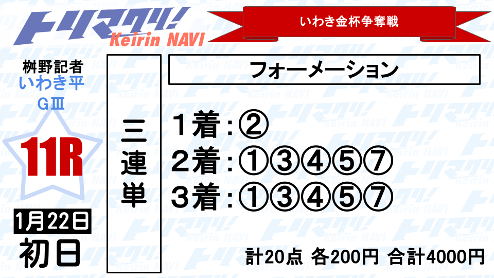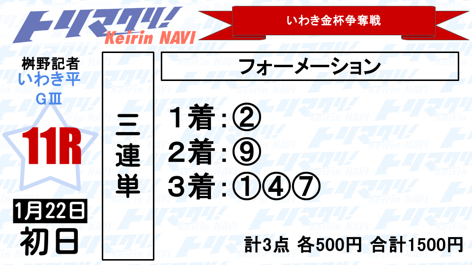 ①谷口遼が上位の機動力をしっかりと発揮できそうなメンバーの4分戦。マークする⑤川口公も前走では山口拳の踏み出しに対応していた。着ほど悪い感じはないので、中部コンビを厚めに買う。捲り追込みになった時は②島川将、④鈴木謙、③坂本周のハサミ目も念のため。