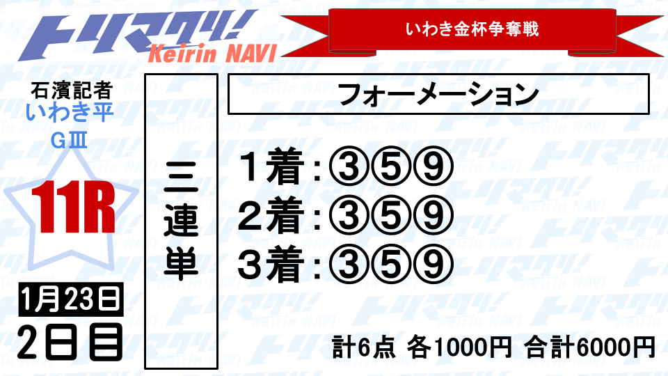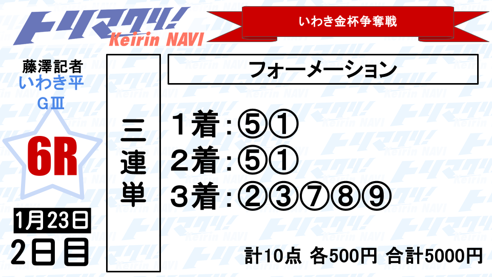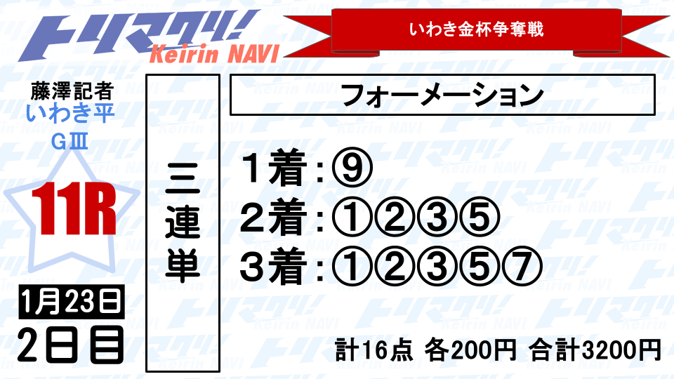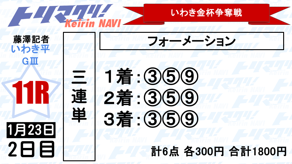 ⑤山崎賢は一走した感じ脚が戻っている。ラインも唯一の三車と恵まれた番組だし、車番も内枠をもらった。ロングの仕掛けで①小川勇とのマッチレースだ。3着はスジの⑥佐々木則と自力型を加える。