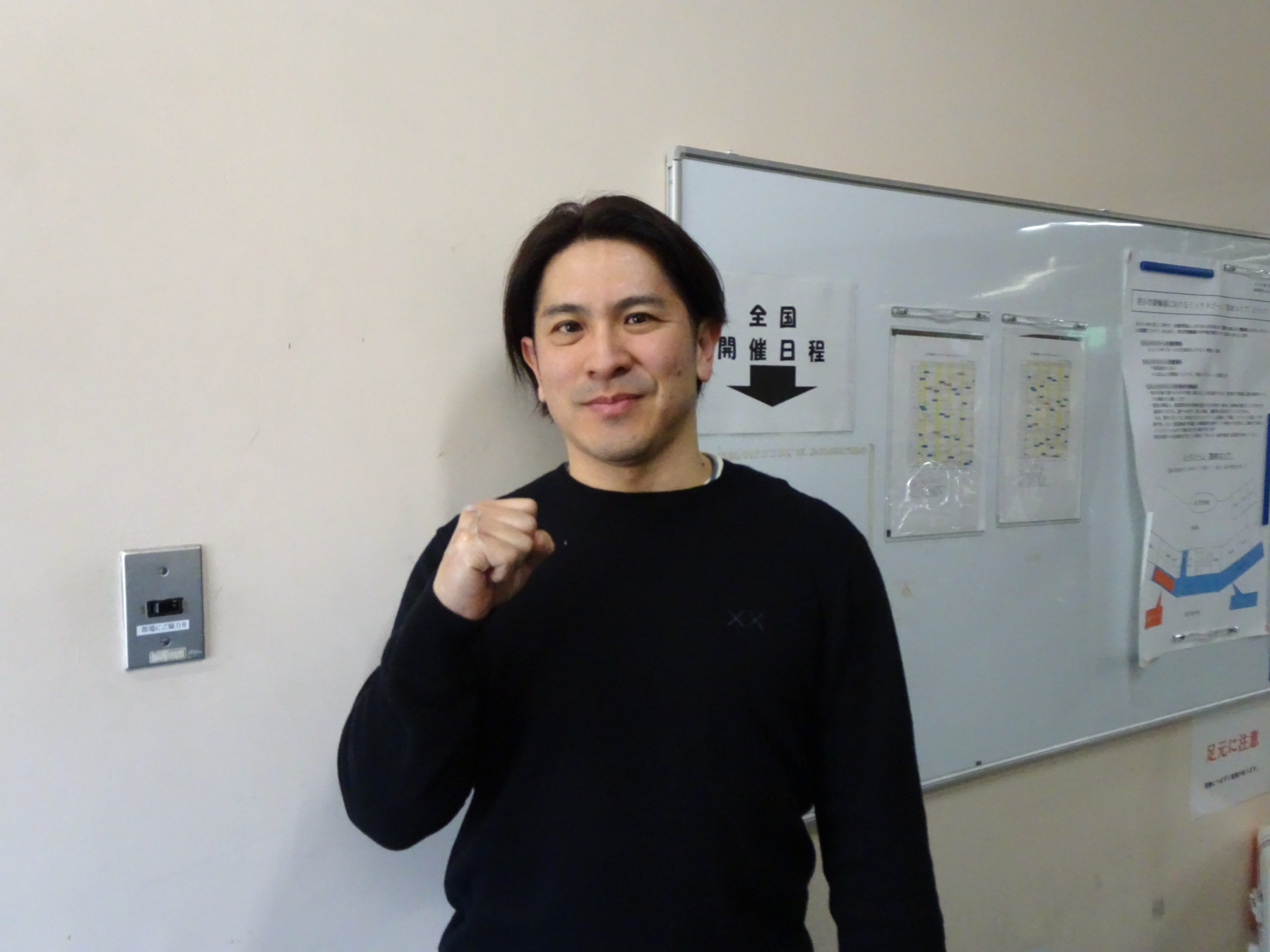 「去年の年末からインフルにギックリ腰、そして前回(和歌山)の落車ですよ。厄年は終わったはずなのに。でも、体は擦過傷と打撲だけで次の日から練習はできた。自転車も大丈夫。空いて今回出直せると思う。初日は志田君へ」